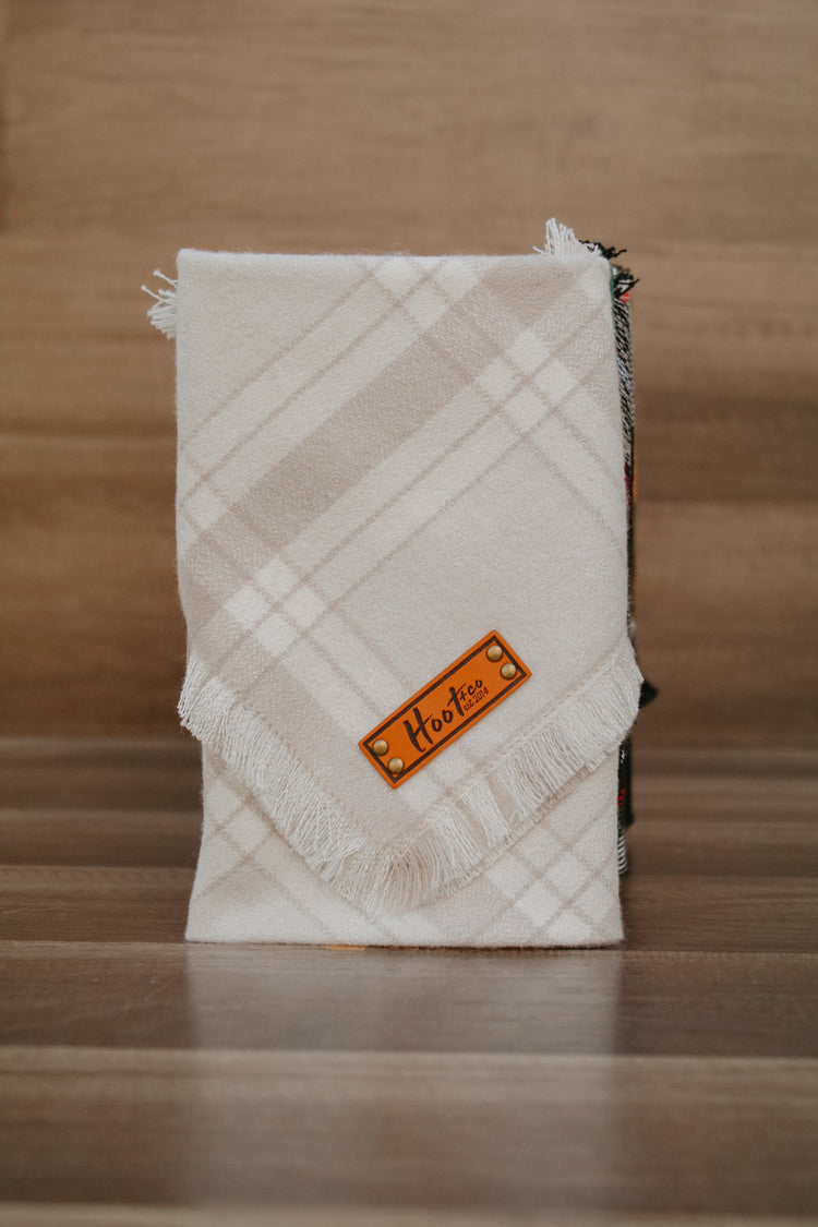 Snap On Bandana - Cotton flannel fabric, a coordinating solid backing and a durable Hoot + Co logo metal snap. Each bandana is hand cut and sewn to fit your animal precisely. Our bandanas feature a curved neck for a comfortable fit that won’t bunch up. All of our bandanas are reversible! Just simply snap them on the other way and you have a solid bandana also, perfect for adding your favorite patch to!