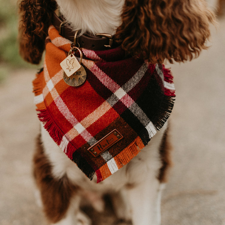 Frayed Bandana - Each bandana features a faux leather tag, frayed edges around all four edges, and an added snap for durability. Simply roll + tie the bandana to fit your pup. This style has more sizing adjustability than a snap on.