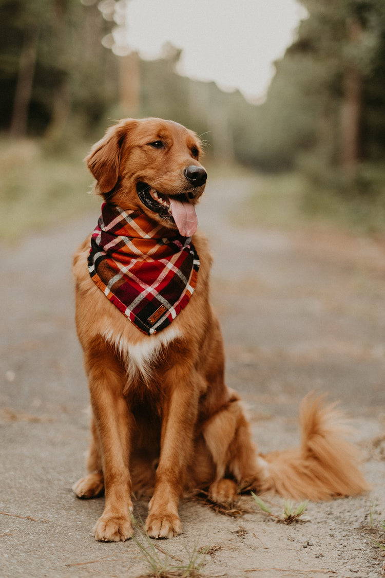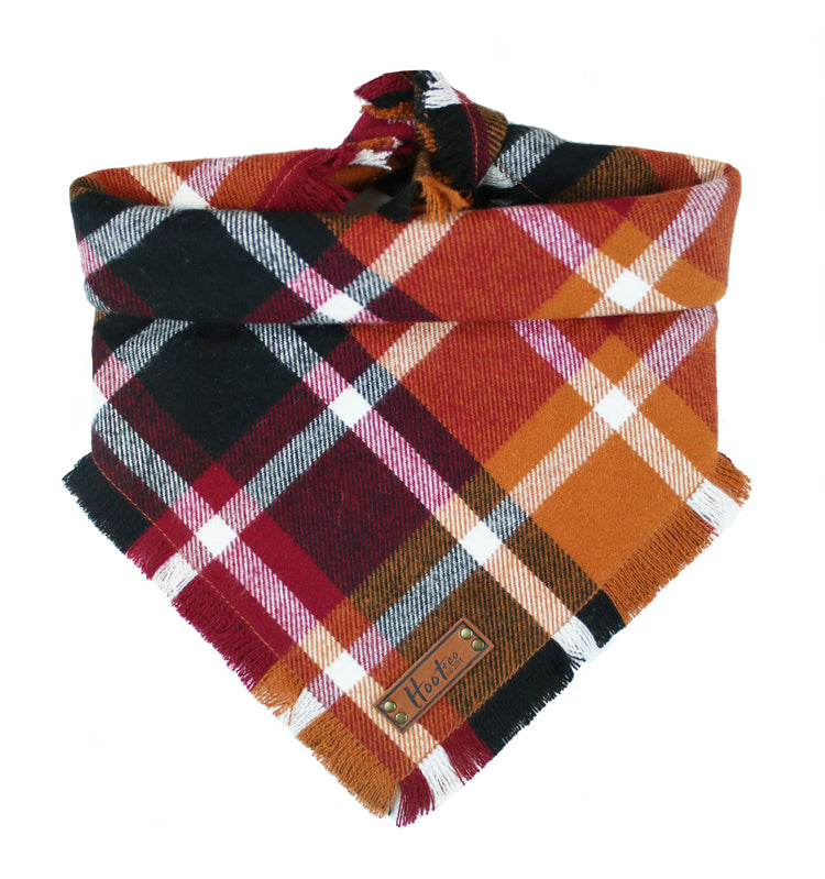 Snap On Bandana - Cotton flannel fabric, a coordinating solid backing and a durable Hoot + Co logo metal snap. Each bandana is hand cut and sewn to fit your animal precisely. Our bandanas feature a curved neck for a comfortable fit that won’t bunch up. All of our bandanas are reversible! Just simply snap them on the other way and you have a solid bandana also, perfect for adding your favorite patch to!