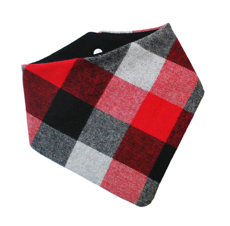 Snap On Bandana - Cotton flannel fabric, a coordinating solid backing and a durable Hoot + Co logo metal snap. Each bandana is hand cut and sewn to fit your animal precisely. Our bandanas feature a curved neck for a comfortable fit that won’t bunch up. All of our bandanas are reversible! Just simply snap them on the other way and you have a solid bandana also, perfect for adding your favorite patch to!