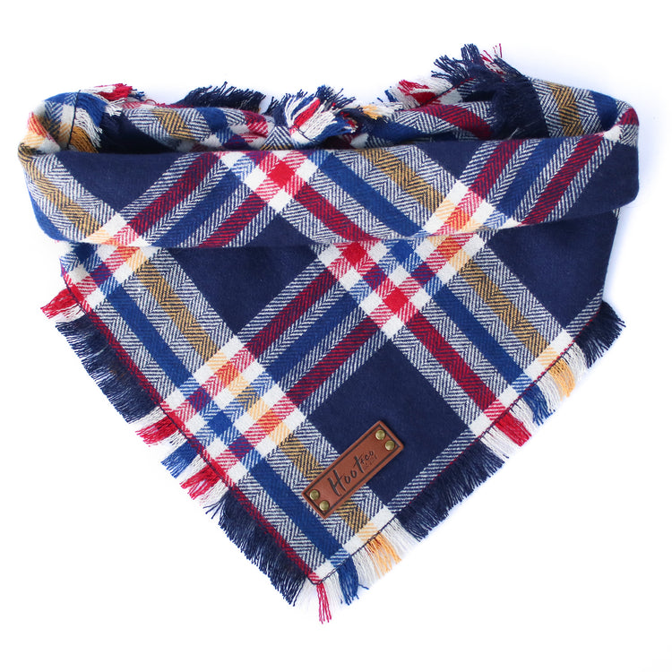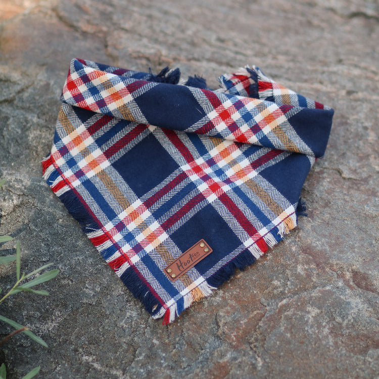 Snap On Bandana - Cotton flannel fabric, a coordinating solid backing and a durable Hoot + Co logo metal snap. Each bandana is hand cut and sewn to fit your animal precisely. Our bandanas feature a curved neck for a comfortable fit that won’t bunch up. All of our bandanas are reversible! Just simply snap them on the other way and you have a solid bandana also, perfect for adding your favorite patch to!