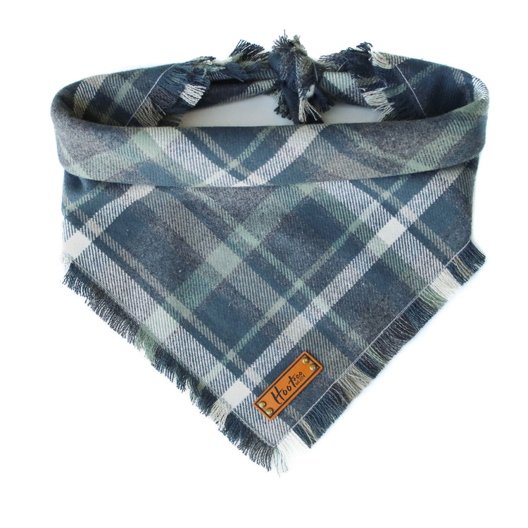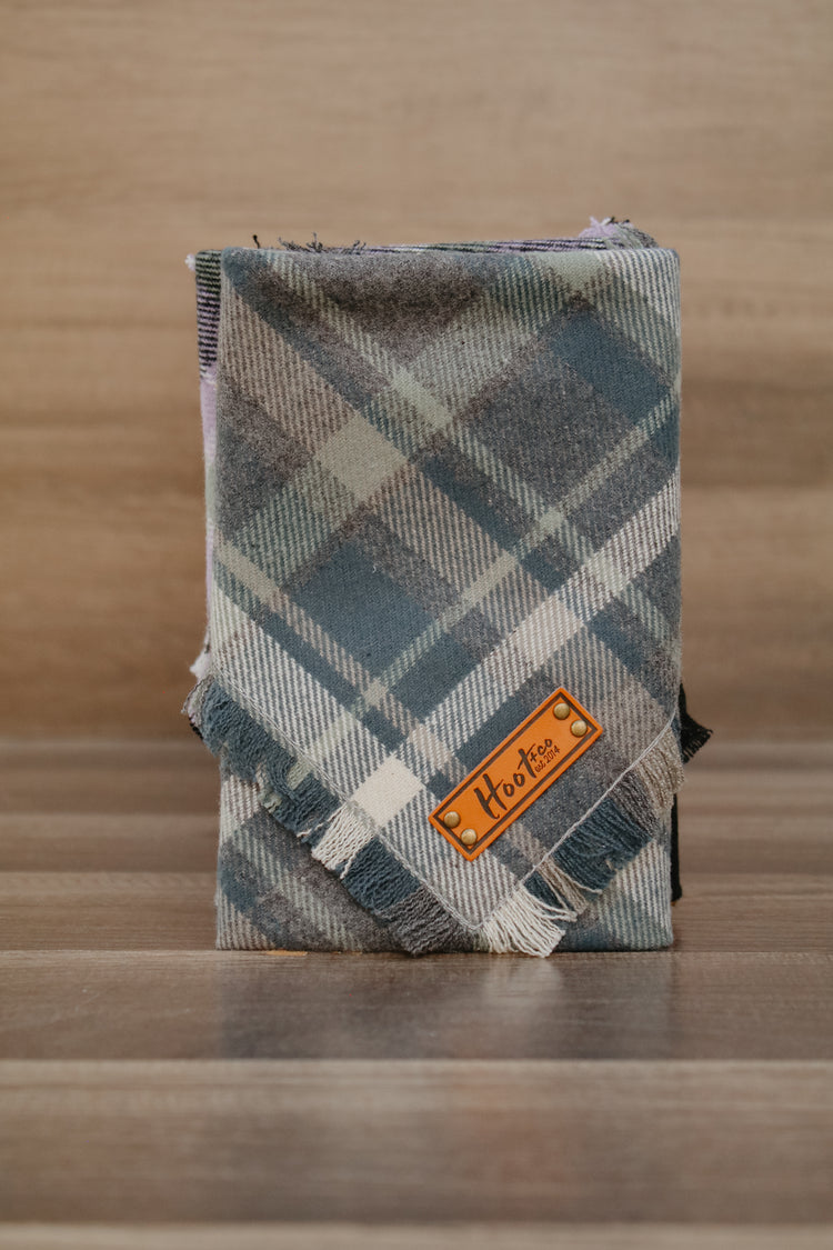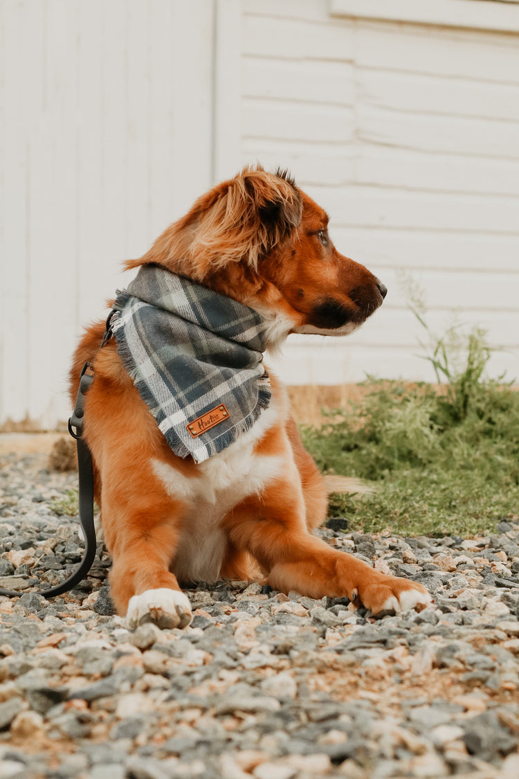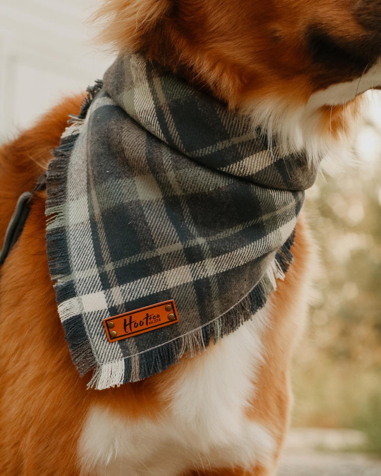 Snap On Bandana - Cotton flannel fabric, a coordinating solid backing and a durable Hoot + Co logo metal snap. Each bandana is hand cut and sewn to fit your animal precisely. Our bandanas feature a curved neck for a comfortable fit that won’t bunch up. All of our bandanas are reversible! Just simply snap them on the other way and you have a solid bandana also, perfect for adding your favorite patch to!