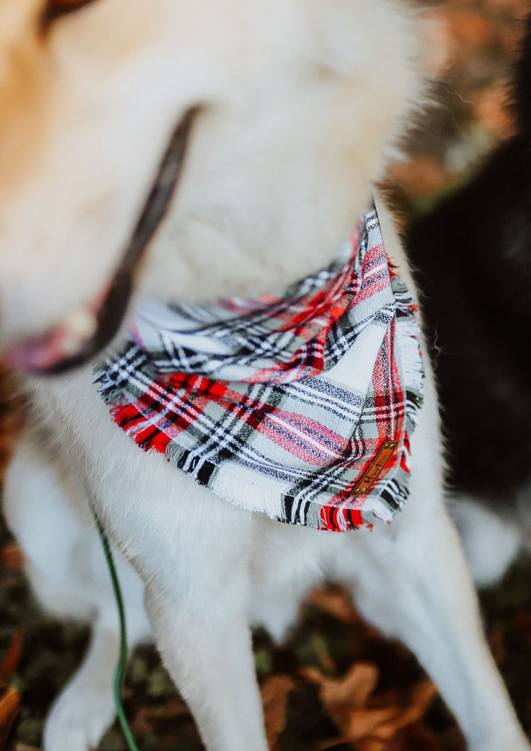 Frayed Bandana - Each bandana features a faux leather tag, frayed edges around all four edges, and an added snap for durability. Simply roll + tie the bandana to fit your pup. This style has more sizing adjustability than a snap on.