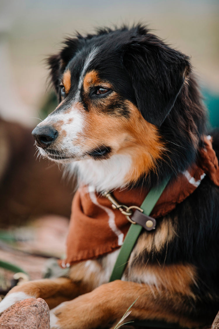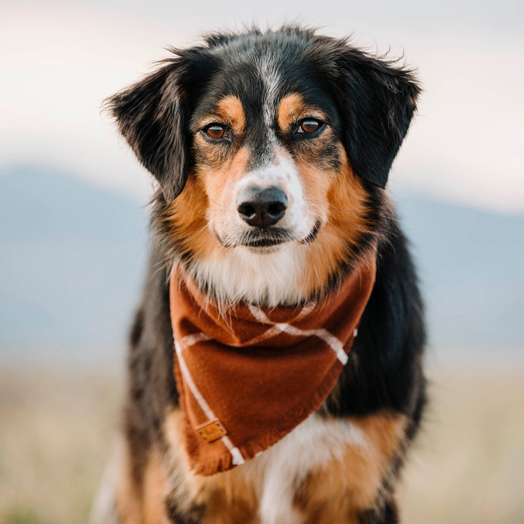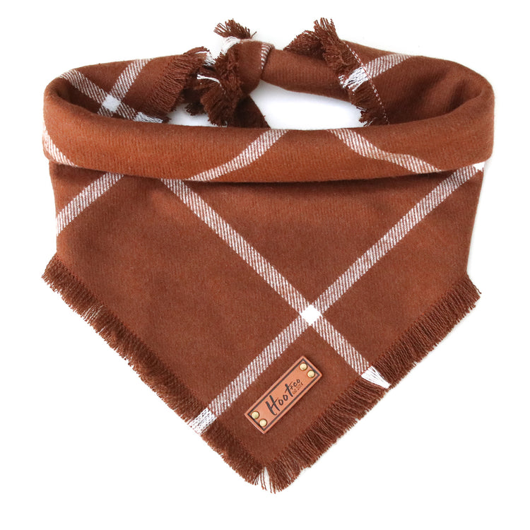 Snap On Bandana - Cotton flannel fabric, a coordinating solid backing and a durable Hoot + Co logo metal snap. Each bandana is hand cut and sewn to fit your animal precisely. Our bandanas feature a curved neck for a comfortable fit that won’t bunch up. All of our bandanas are reversible! Just simply snap them on the other way and you have a solid bandana also, perfect for adding your favorite patch to!