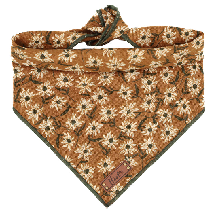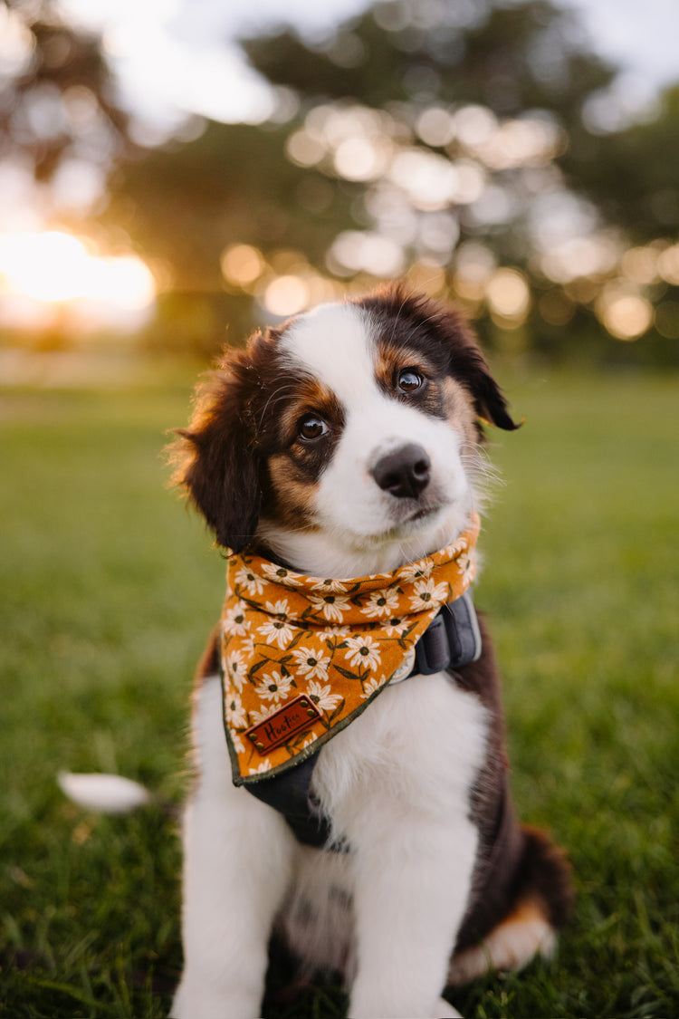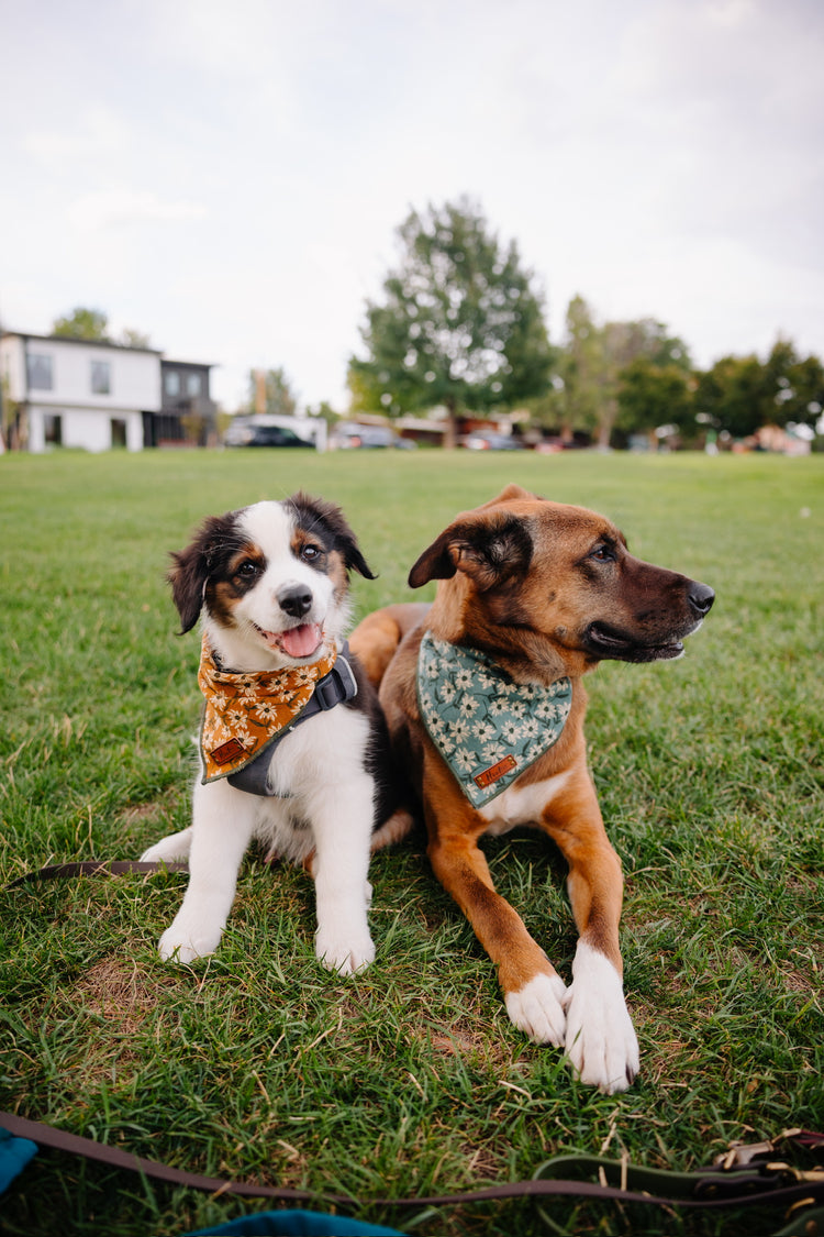 Rolled Bandana - Each bandana features a faux leather tag, frayed edges around all four edges, and an added snap for durability. Simply roll + tie the bandana to fit your pup. This style has more sizing adjustability than a snap on.