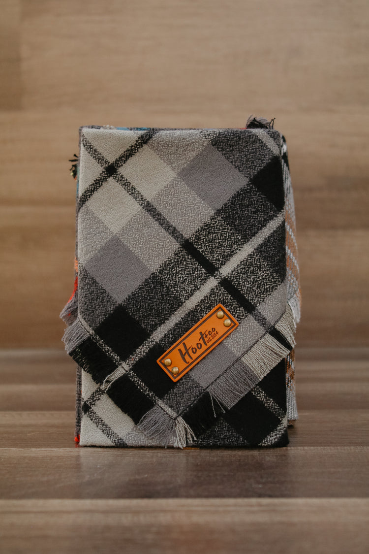 Snap On Bandana - Cotton flannel fabric, a coordinating solid backing and a durable Hoot + Co logo metal snap. Each bandana is hand cut and sewn to fit your animal precisely. Our bandanas feature a curved neck for a comfortable fit that won’t bunch up. All of our bandanas are reversible! Just simply snap them on the other way and you have a solid bandana also, perfect for adding your favorite patch to!