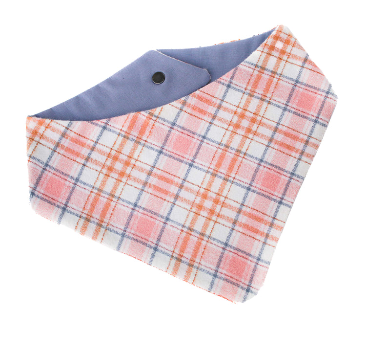 Snap On Bandana - Cotton flannel fabric, a coordinating solid backing and a durable Hoot + Co logo metal snap. Each bandana is hand cut and sewn to fit your animal precisely. Our bandanas feature a curved neck for a comfortable fit that won’t bunch up. All of our bandanas are reversible! Just simply snap them on the other way and you have a solid bandana also, perfect for adding your favorite patch to!