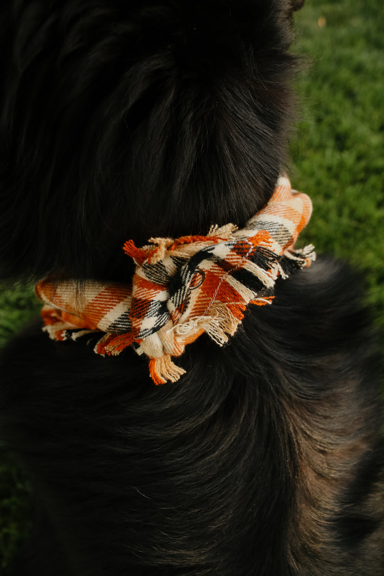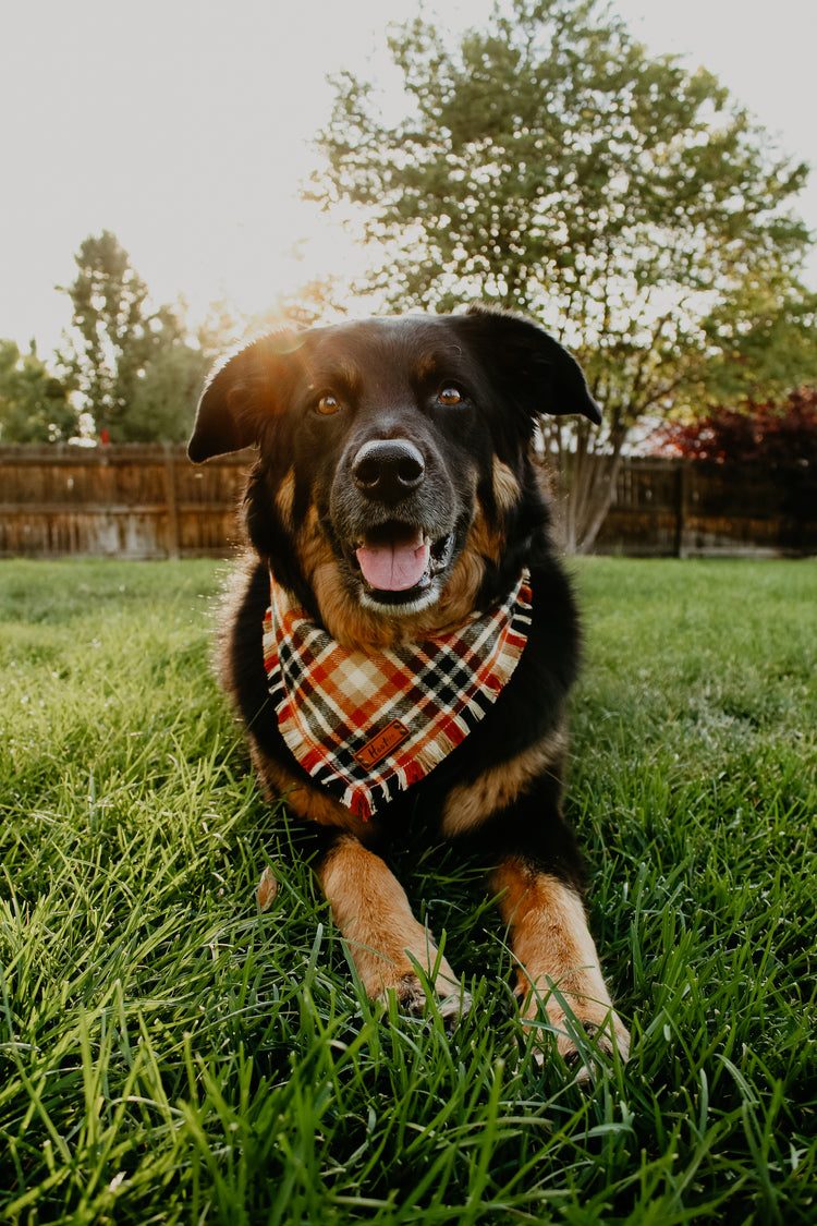 Frayed Bandana - Each bandana features a faux leather tag, frayed edges around all four edges, and an added snap for durability. Simply roll + tie the bandana to fit your pup. This style has more sizing adjustability than a snap on.