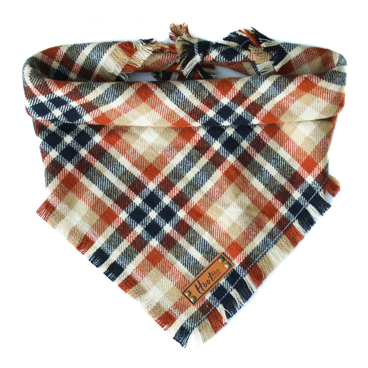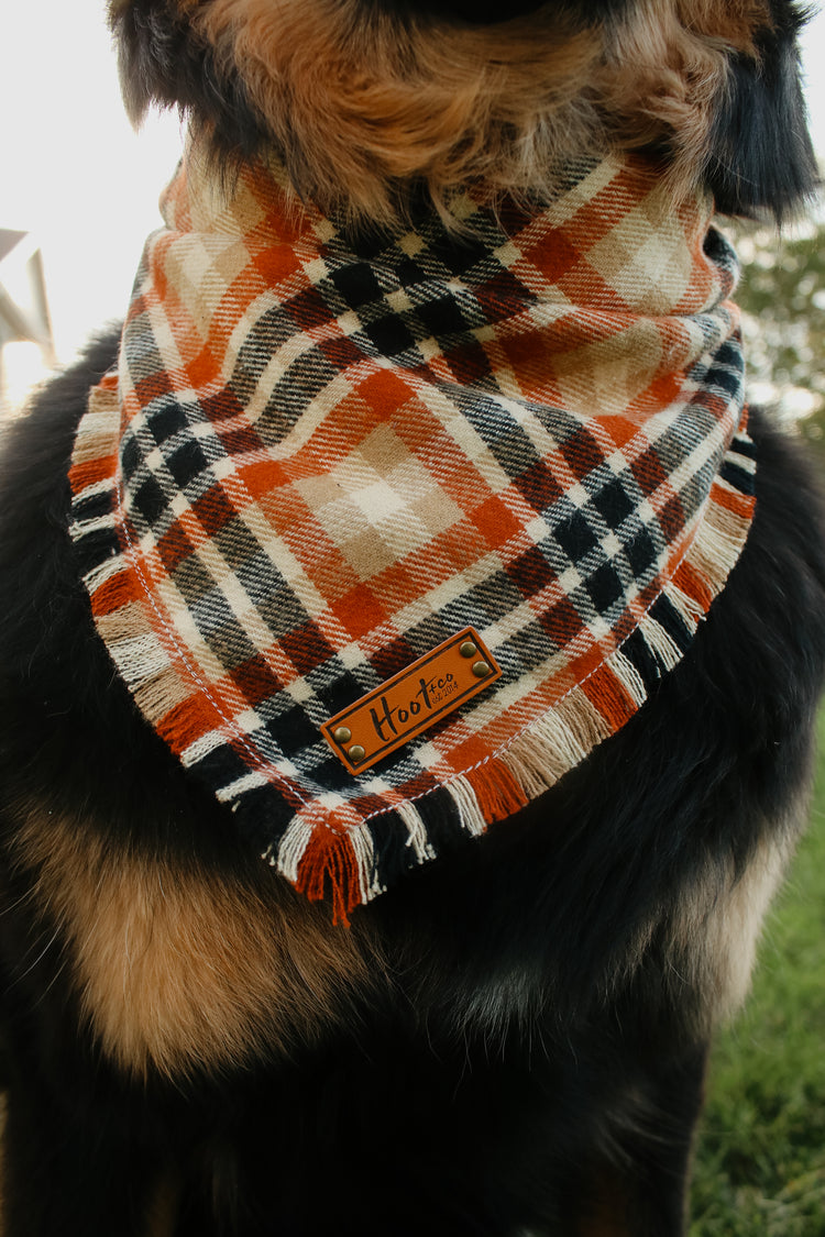 Snap On Bandana - Cotton flannel fabric, a coordinating solid backing and a durable Hoot + Co logo metal snap. Each bandana is hand cut and sewn to fit your animal precisely. Our bandanas feature a curved neck for a comfortable fit that won’t bunch up. All of our bandanas are reversible! Just simply snap them on the other way and you have a solid bandana also, perfect for adding your favorite patch to!