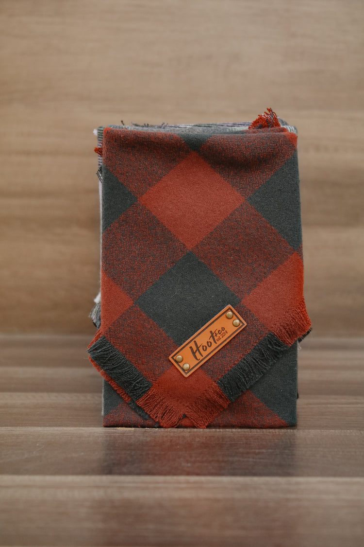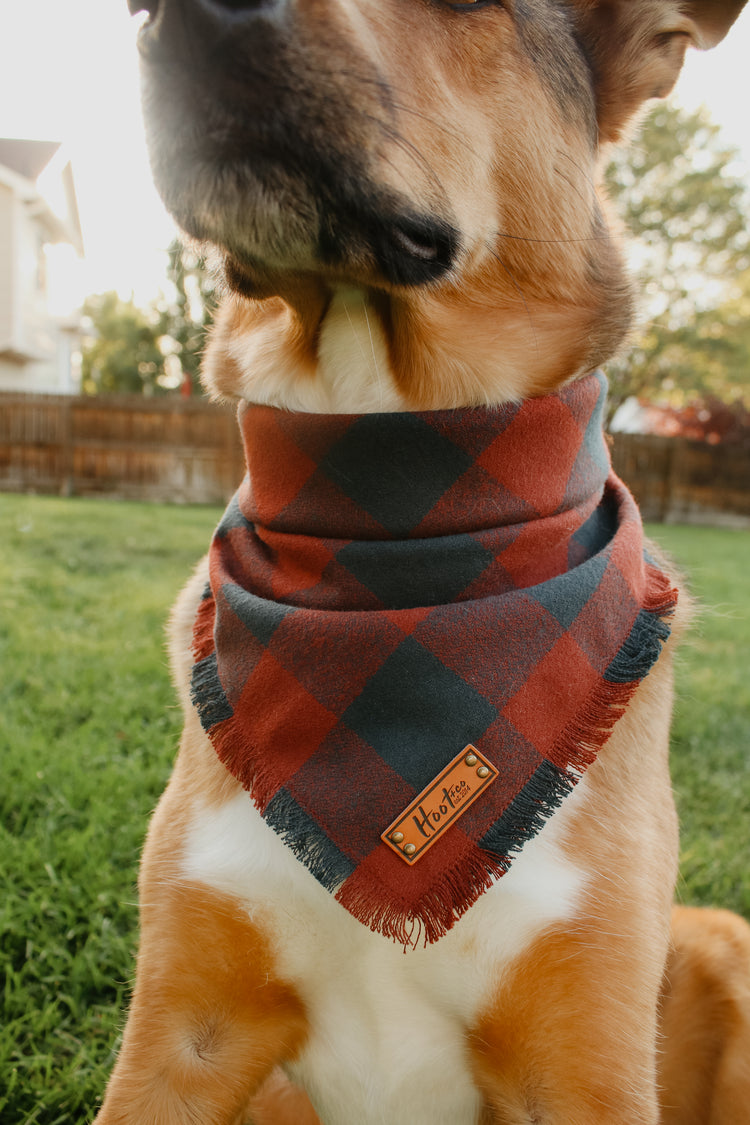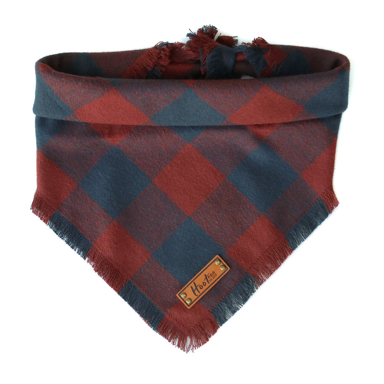 Snap On Bandana - Cotton flannel fabric, a coordinating solid backing and a durable Hoot + Co logo metal snap. Each bandana is hand cut and sewn to fit your animal precisely. Our bandanas feature a curved neck for a comfortable fit that won’t bunch up. All of our bandanas are reversible! Just simply snap them on the other way and you have a solid bandana also, perfect for adding your favorite patch to!