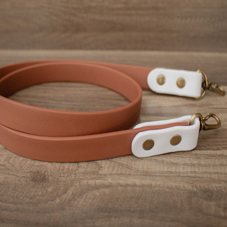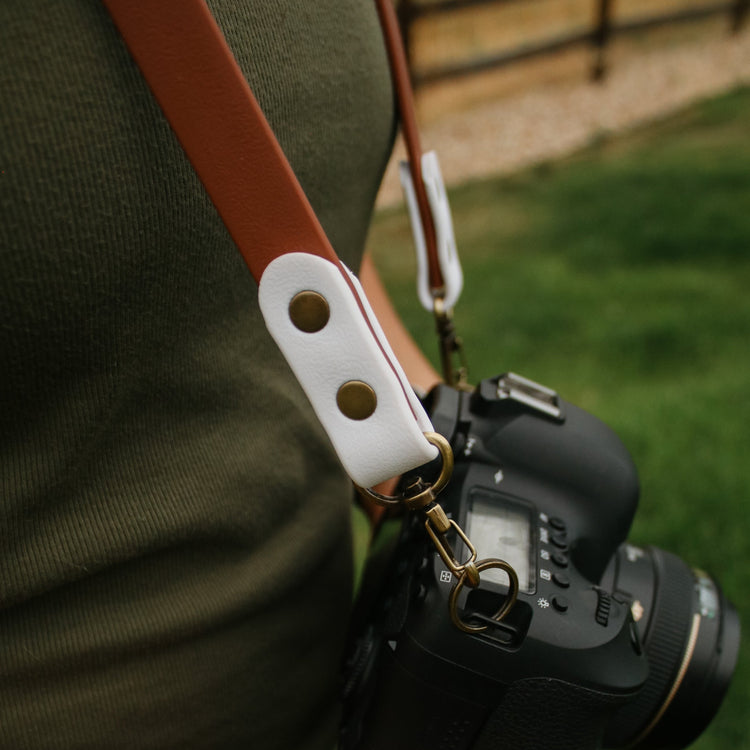 Our new camera straps come at a fixed length of 36" from end to end. They feature an easy clip on end for easy attachment. All our straps are made using a durable coated webbing. They are NOT leather.