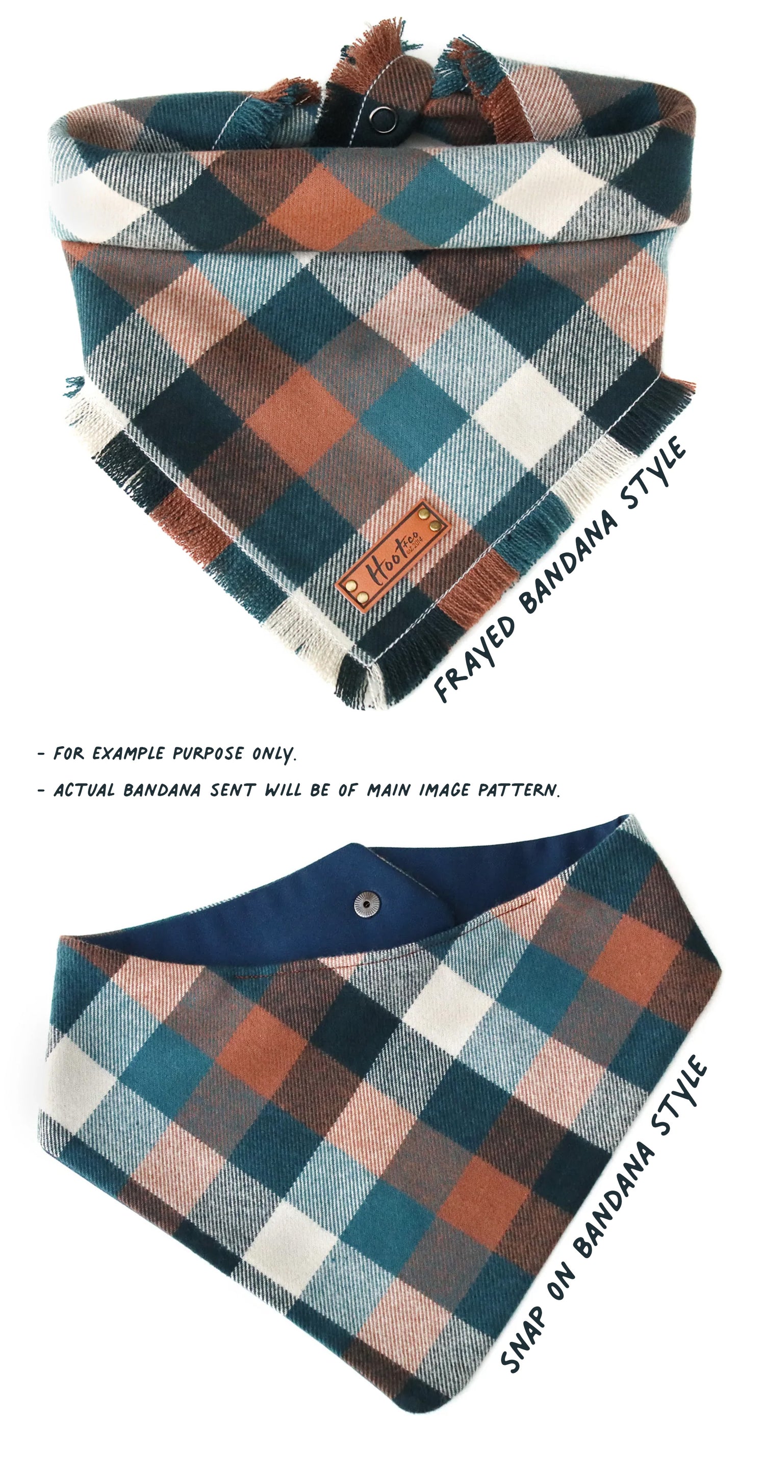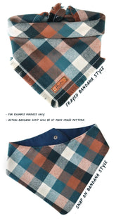 Snap On Bandana - Cotton flannel fabric, a coordinating solid backing and a durable Hoot + Co logo metal snap. Each bandana is hand cut and sewn to fit your animal precisely. Our bandanas feature a curved neck for a comfortable fit that won’t bunch up. All of our bandanas are reversible! Just simply snap them on the other way and you have a solid bandana also, perfect for adding your favorite patch to!