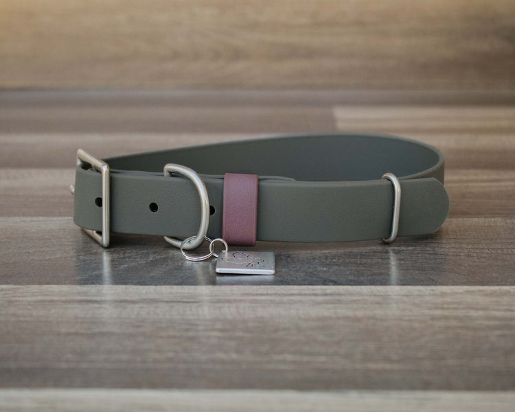 Your new favorite adventure collar! All of our collars are made with a custom coated webbing and our very own colors! Although they may look similar to leather, they are made with a durable coated webbing that can withstand the elements. They are waterproof, mold resistant, and low maintenance! We use zinc alloy coated buckles and solid brass hardware, both of which are resistant to rust. Brass hardware can patina with use when exposed to water + sun and may rub onto lighter coated coats.
