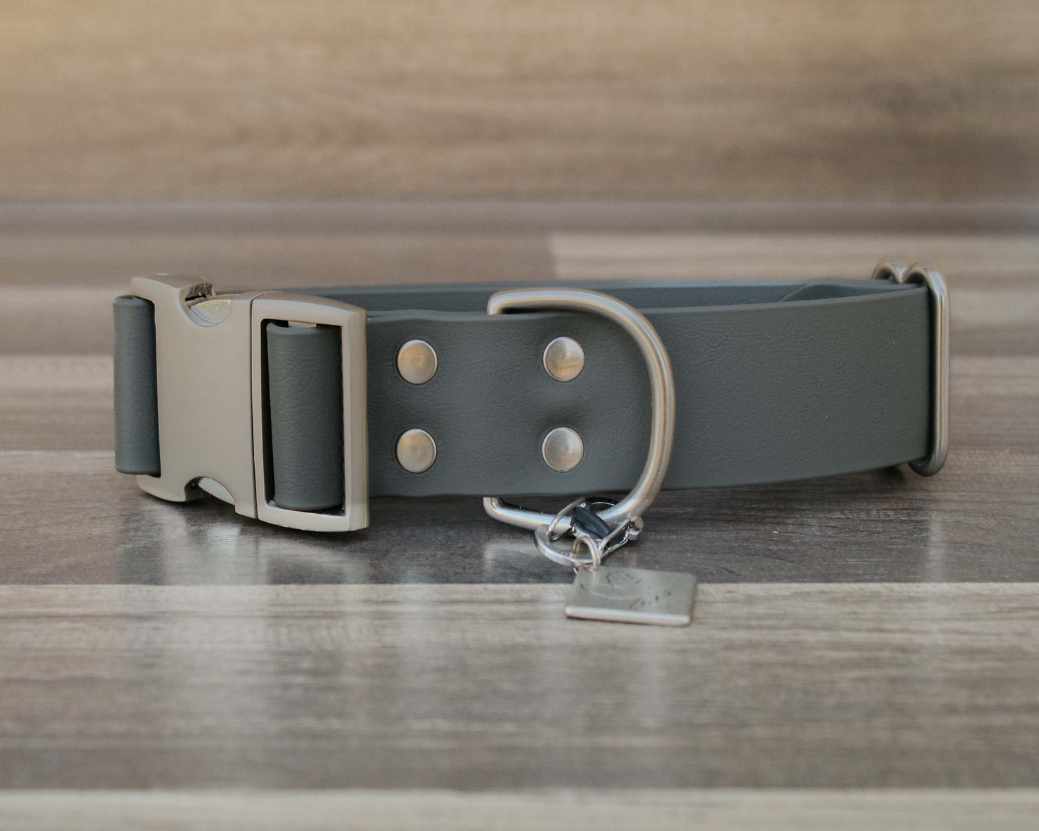 Your new favorite adventure collar! All of our collars are made with a custom coated webbing and our very own colors! Although they may look similar to leather, they are made with a durable coated webbing that can withstand the elements. They are waterproof, mold resistant, and low maintenance! We use zinc alloy coated buckles and solid brass hardware, both of which are resistant to rust. Brass hardware can patina with use when exposed to water + sun and may rub onto lighter coated coats.
