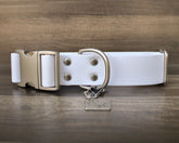 Your new favorite adventure collar! All of our collars are made with a custom coated webbing and our very own colors! Although they may look similar to leather, they are made with a durable coated webbing that can withstand the elements. They are waterproof, mold resistant, and low maintenance! We use zinc alloy coated buckles and solid brass hardware, both of which are resistant to rust. Brass hardware can patina with use when exposed to water + sun and may rub onto lighter coated coats.