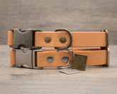 Your new favorite adventure collar! All of our collars are made with a custom coated webbing and our very own colors! Although they may look similar to leather, they are made with a durable coated webbing that can withstand the elements. They are waterproof, mold resistant, and low maintenance! We use zinc alloy coated buckles and solid brass hardware, both of which are resistant to rust. Brass hardware can patina with use when exposed to water + sun and may rub onto lighter coated coats.