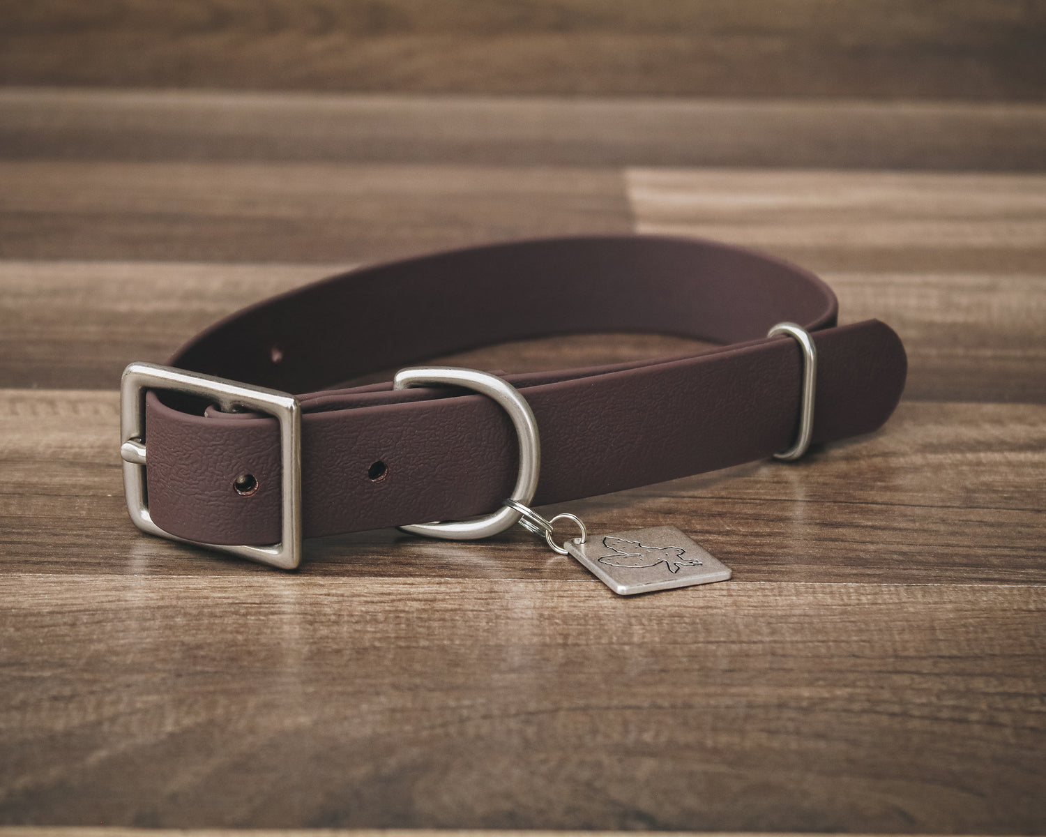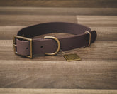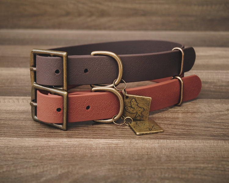 Your new favorite adventure collar! All of our collars are made with a custom coated webbing and our very own colors! Although they may look similar to leather, they are made with a durable coated webbing that can withstand the elements. They are waterproof, mold resistant, and low maintenance! We use zinc alloy coated buckles and solid brass hardware, both of which are resistant to rust. Brass hardware can patina with use when exposed to water + sun and may rub onto lighter coated coats.
