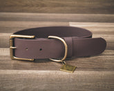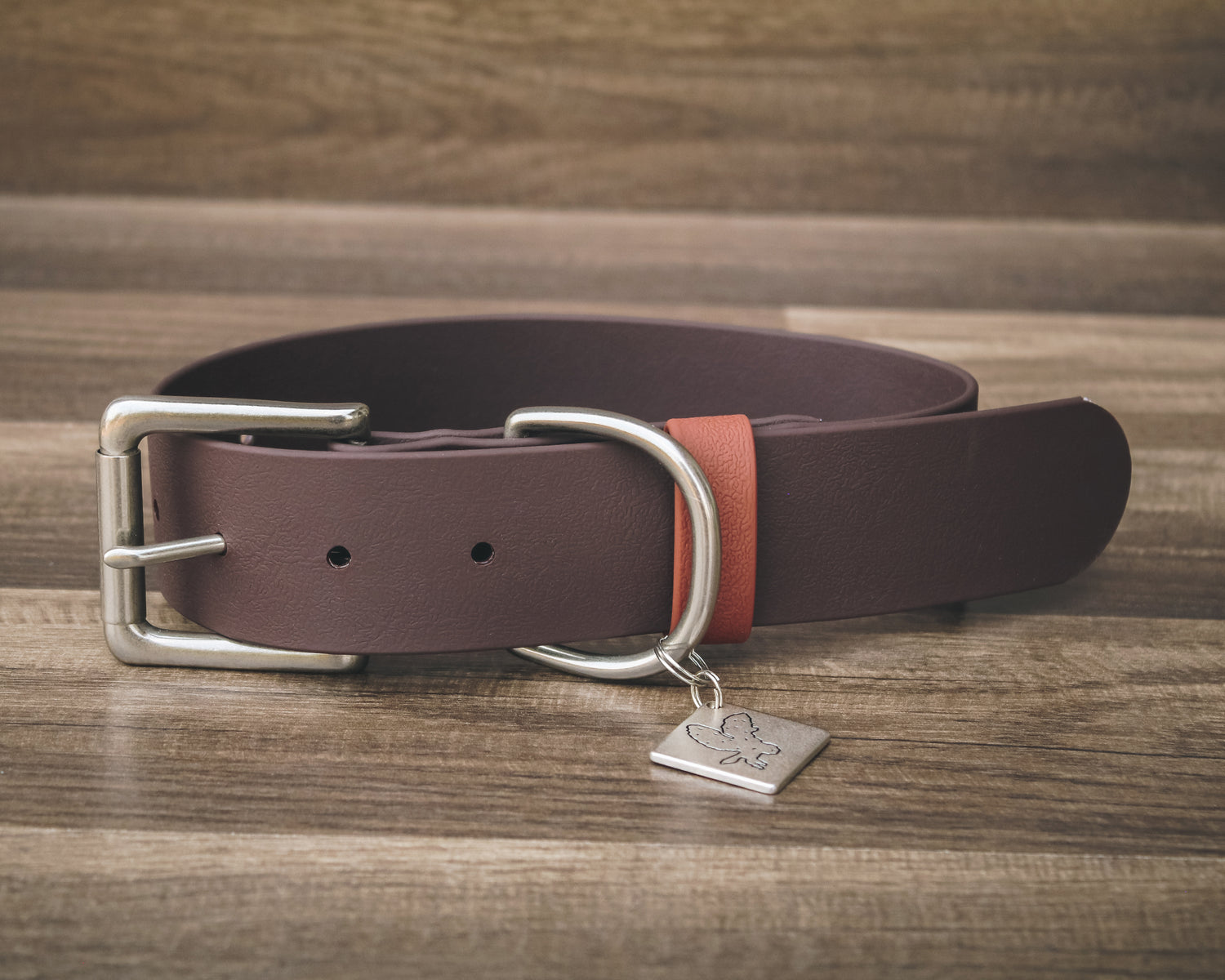 Your new favorite adventure collar! All of our collars are made with a custom coated webbing and our very own colors! Although they may look similar to leather, they are made with a durable coated webbing that can withstand the elements. They are waterproof, mold resistant, and low maintenance! We use zinc alloy coated buckles and solid brass hardware, both of which are resistant to rust. Brass hardware can patina with use when exposed to water + sun and may rub onto lighter coated coats.