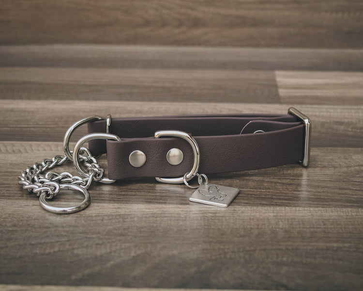 Your new favorite adventure collar! All of our collars are made with a custom coated webbing and our very own colors! Although they may look similar to leather, they are made with a durable coated webbing that can withstand the elements. They are waterproof, mold resistant, and low maintenance! We use stainless steel martingales and solid brass hardware, both of which are resistant to rust.