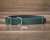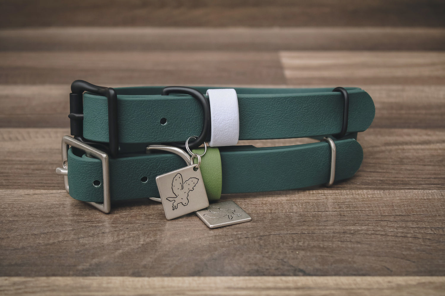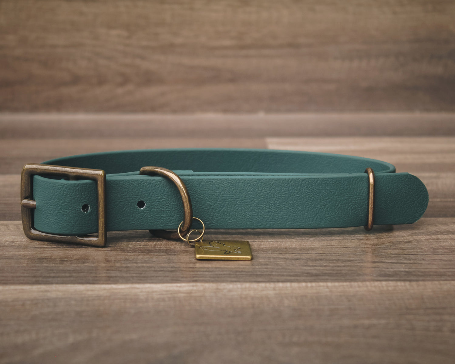 Your new favorite adventure collar! All of our collars are made with a custom coated webbing and our very own colors! Although they may look similar to leather, they are made with a durable coated webbing that can withstand the elements. They are waterproof, mold resistant, and low maintenance! We use zinc alloy coated buckles and solid brass hardware, both of which are resistant to rust. Brass hardware can patina with use when exposed to water + sun and may rub onto lighter coated coats.