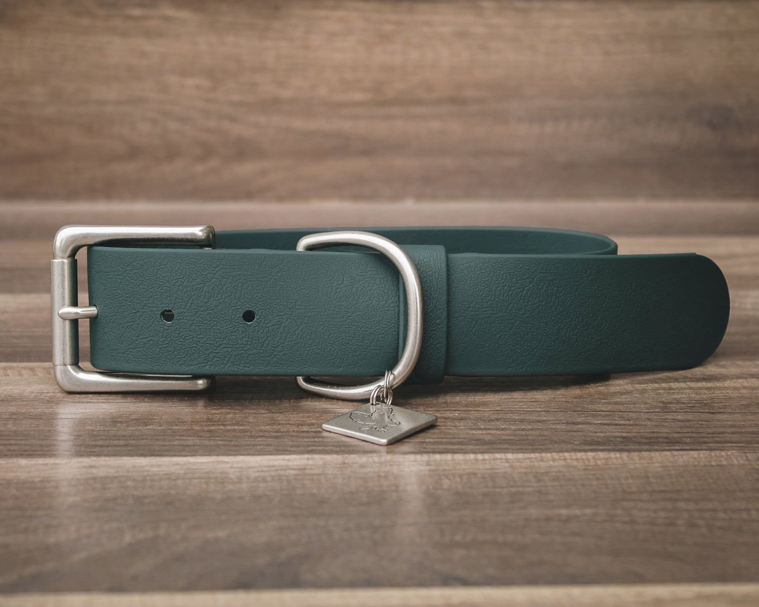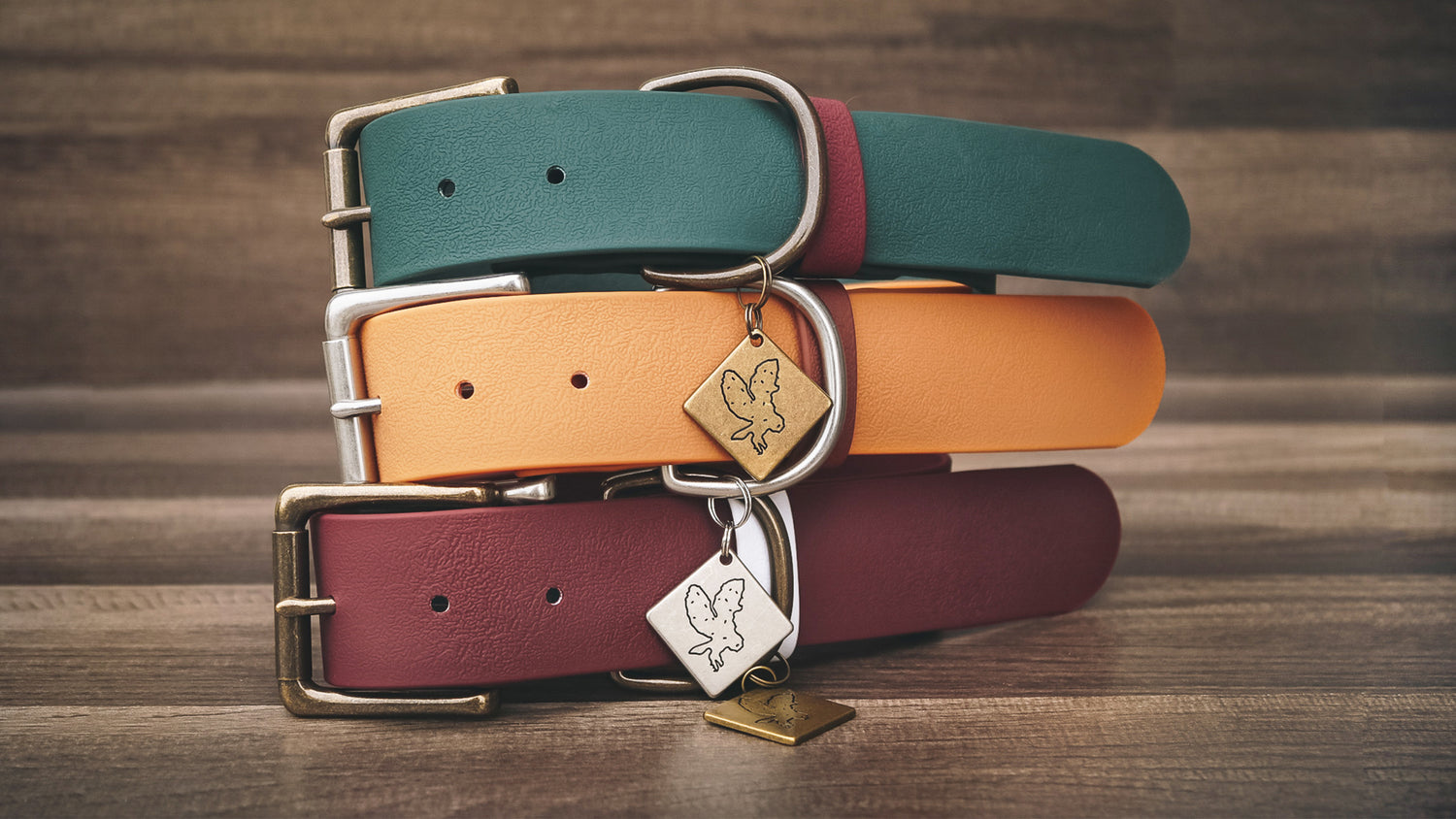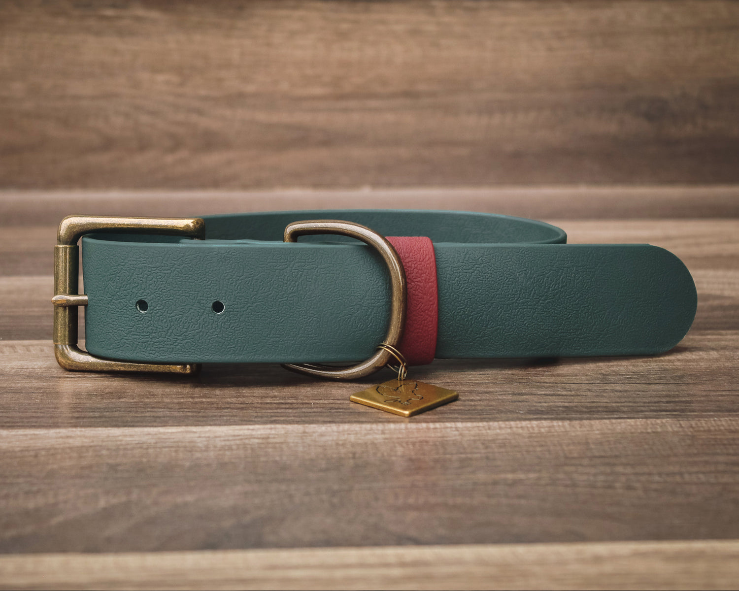 Your new favorite adventure collar! All of our collars are made with a custom coated webbing and our very own colors! Although they may look similar to leather, they are made with a durable coated webbing that can withstand the elements. They are waterproof, mold resistant, and low maintenance! We use zinc alloy coated buckles and solid brass hardware, both of which are resistant to rust. Brass hardware can patina with use when exposed to water + sun and may rub onto lighter coated coats.