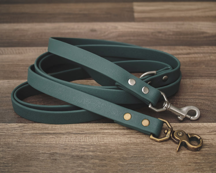Your new favorite adventure leash! All of our leashes are made with a custom coated webbing and our very own colors! Although they may look similar to leather, they are made with a durable coated webbing that can withstand the elements. They are waterproof, mold resistant, and low maintenance! We use solid brass hardware which are resistant to rust. Brass hardware can patina with use when exposed to water + sun and may rub onto lighter coated coats.