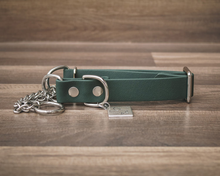 Your new favorite adventure collar! All of our collars are made with a custom coated webbing and our very own colors! Although they may look similar to leather, they are made with a durable coated webbing that can withstand the elements. They are waterproof, mold resistant, and low maintenance! We use stainless steel martingales and solid brass hardware, both of which are resistant to rust.