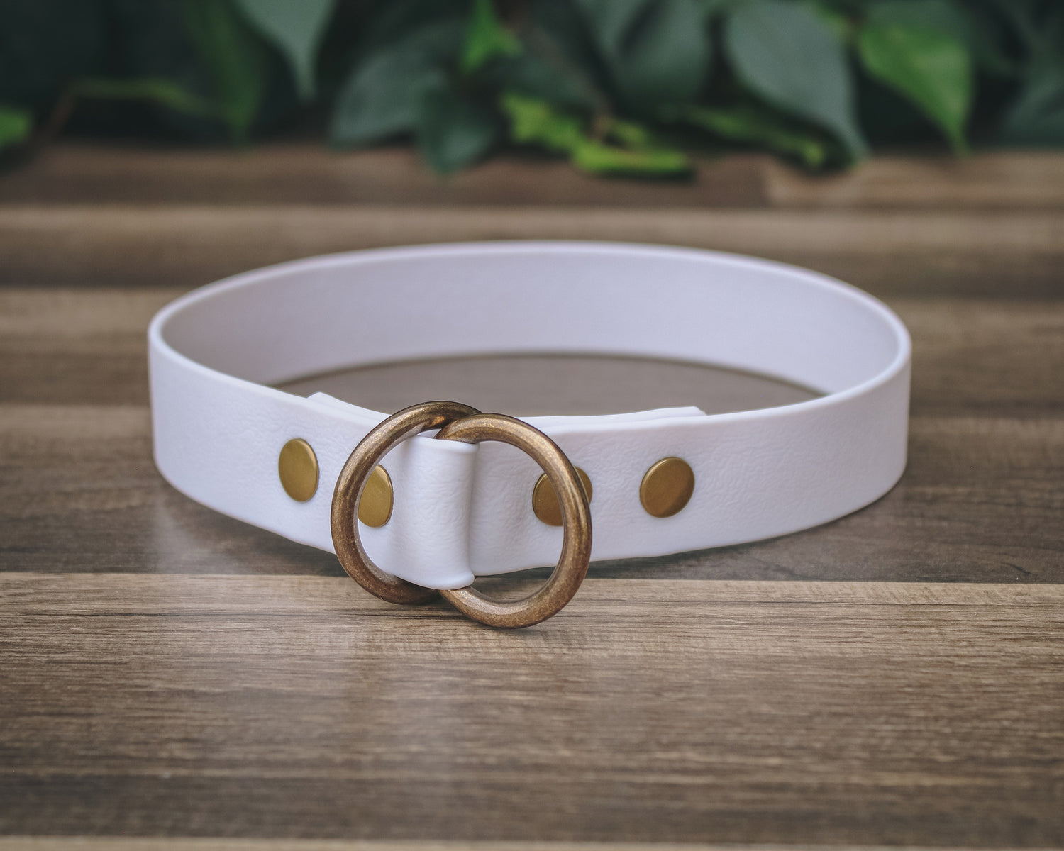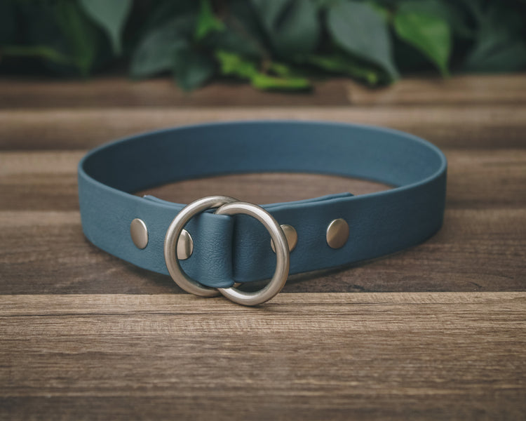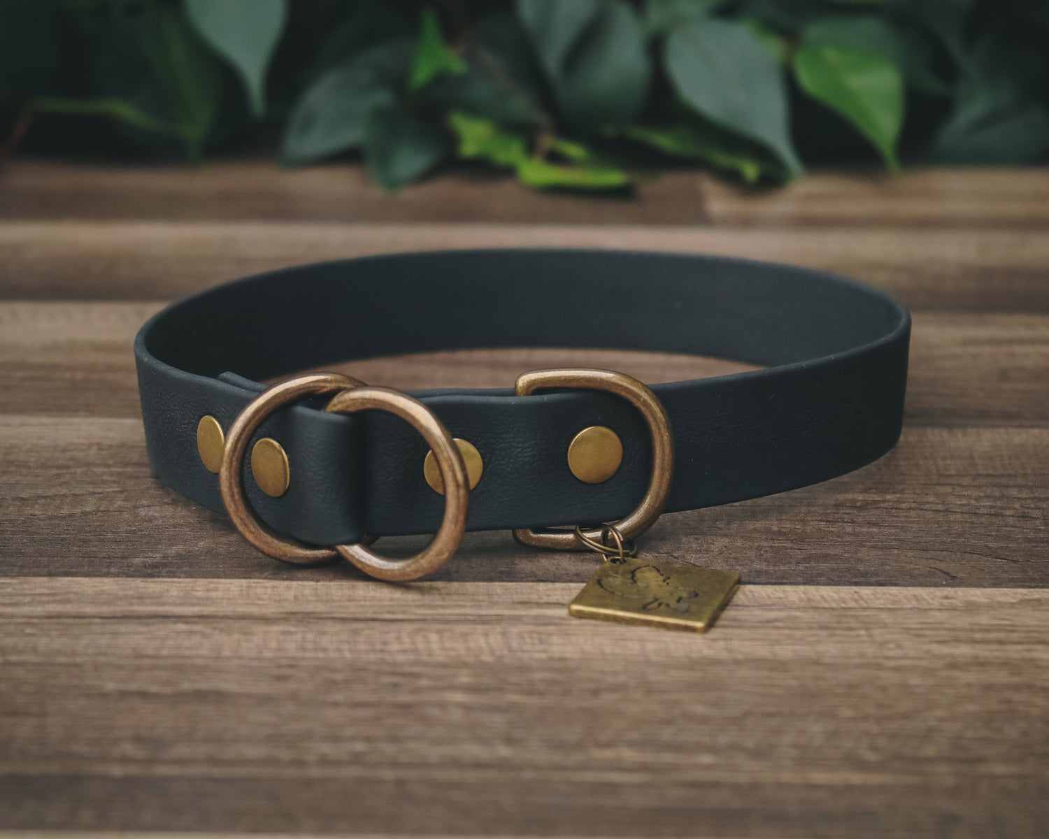 Your new favorite adventure collar! All of our collars are made with a custom coated webbing and our very own colors! Although they may look similar to leather, they are made with a durable coated webbing that can withstand the elements. They are waterproof, mold resistant, and low maintenance! We use solid brass hardware which are resistant to rust. Brass hardware can patina with use when exposed to water + sun and may rub onto lighter coated coats.