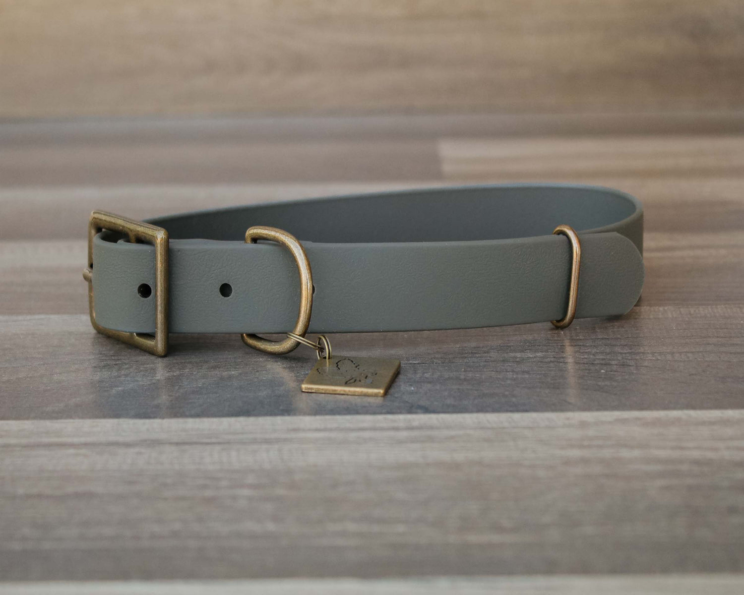 Your new favorite adventure collar! All of our collars are made with a custom coated webbing and our very own colors! Although they may look similar to leather, they are made with a durable coated webbing that can withstand the elements. They are waterproof, mold resistant, and low maintenance! We use zinc alloy coated buckles and solid brass hardware, both of which are resistant to rust. Brass hardware can patina with use when exposed to water + sun and may rub onto lighter coated coats.