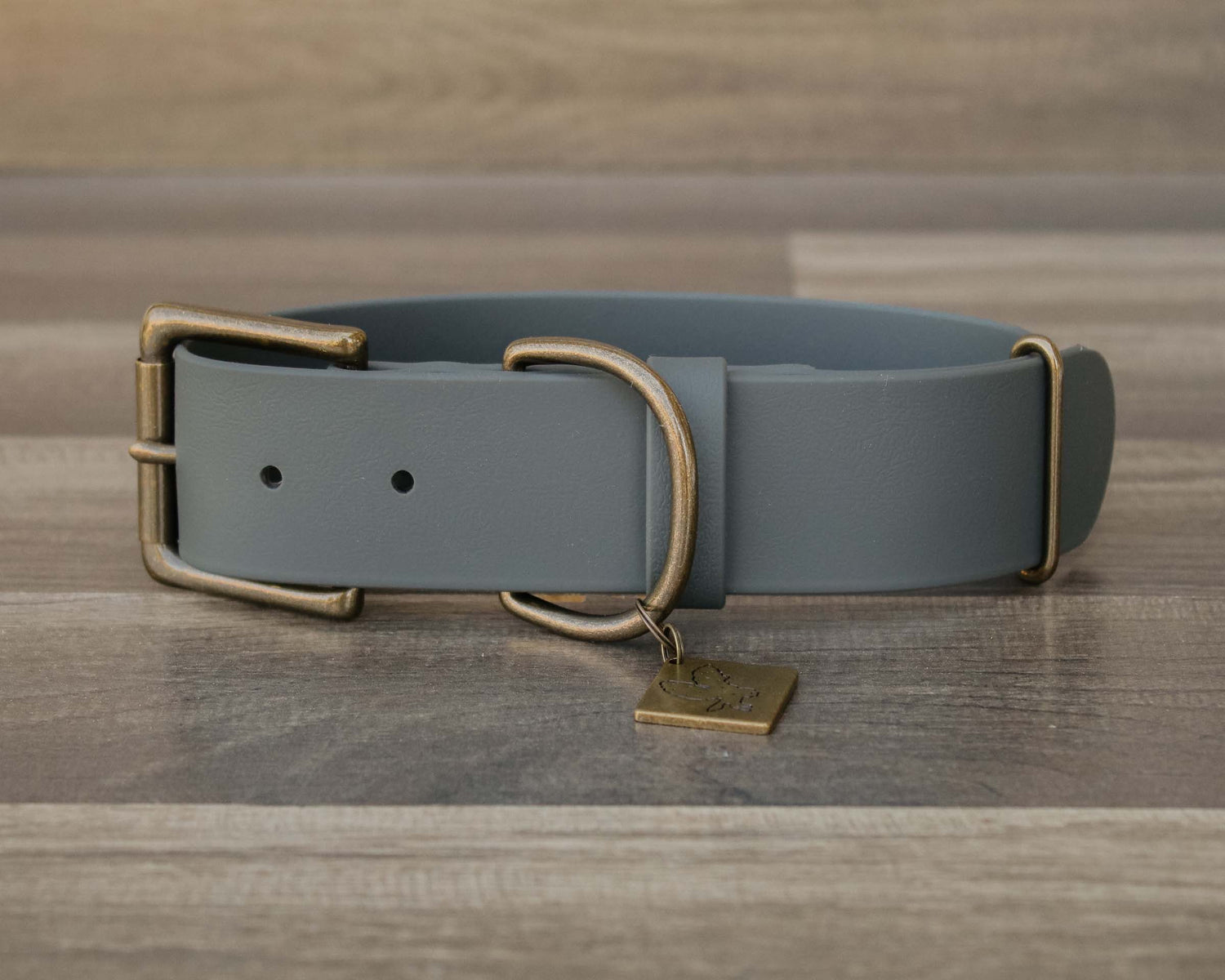 Your new favorite adventure collar! All of our collars are made with a custom coated webbing and our very own colors! Although they may look similar to leather, they are made with a durable coated webbing that can withstand the elements. They are waterproof, mold resistant, and low maintenance! We use zinc alloy coated buckles and solid brass hardware, both of which are resistant to rust. Brass hardware can patina with use when exposed to water + sun and may rub onto lighter coated coats.
