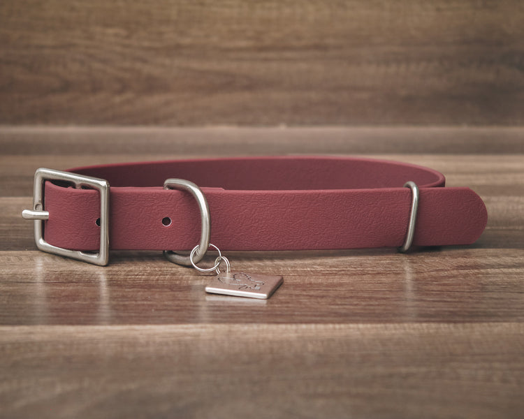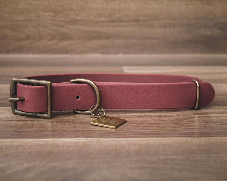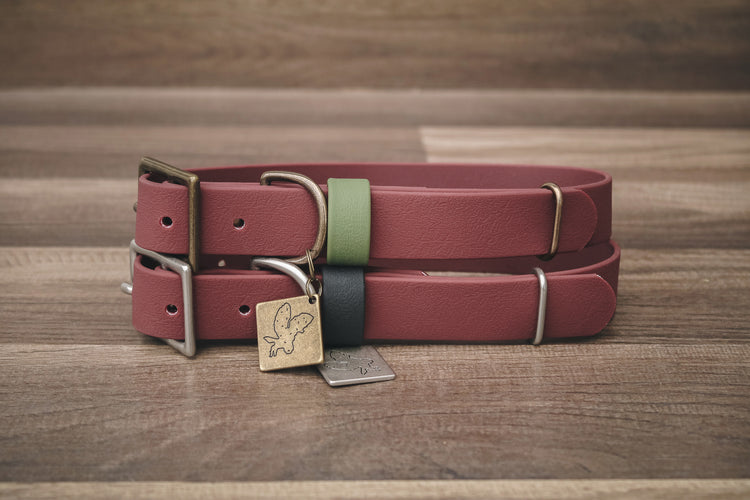 Your new favorite adventure collar! All of our collars are made with a custom coated webbing and our very own colors! Although they may look similar to leather, they are made with a durable coated webbing that can withstand the elements. They are waterproof, mold resistant, and low maintenance! We use zinc alloy coated buckles and solid brass hardware, both of which are resistant to rust. Brass hardware can patina with use when exposed to water + sun and may rub onto lighter coated coats.