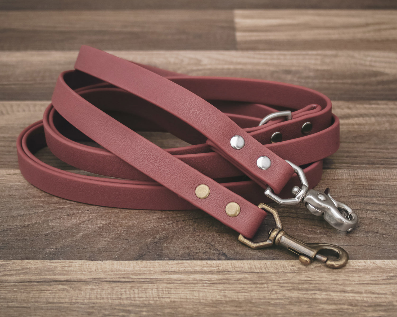 Your new favorite adventure leash! All of our leashes are made with a custom coated webbing and our very own colors! Although they may look similar to leather, they are made with a durable coated webbing that can withstand the elements. They are waterproof, mold resistant, and low maintenance! We use solid brass hardware which are resistant to rust. Brass hardware can patina with use when exposed to water + sun and may rub onto lighter coated coats.