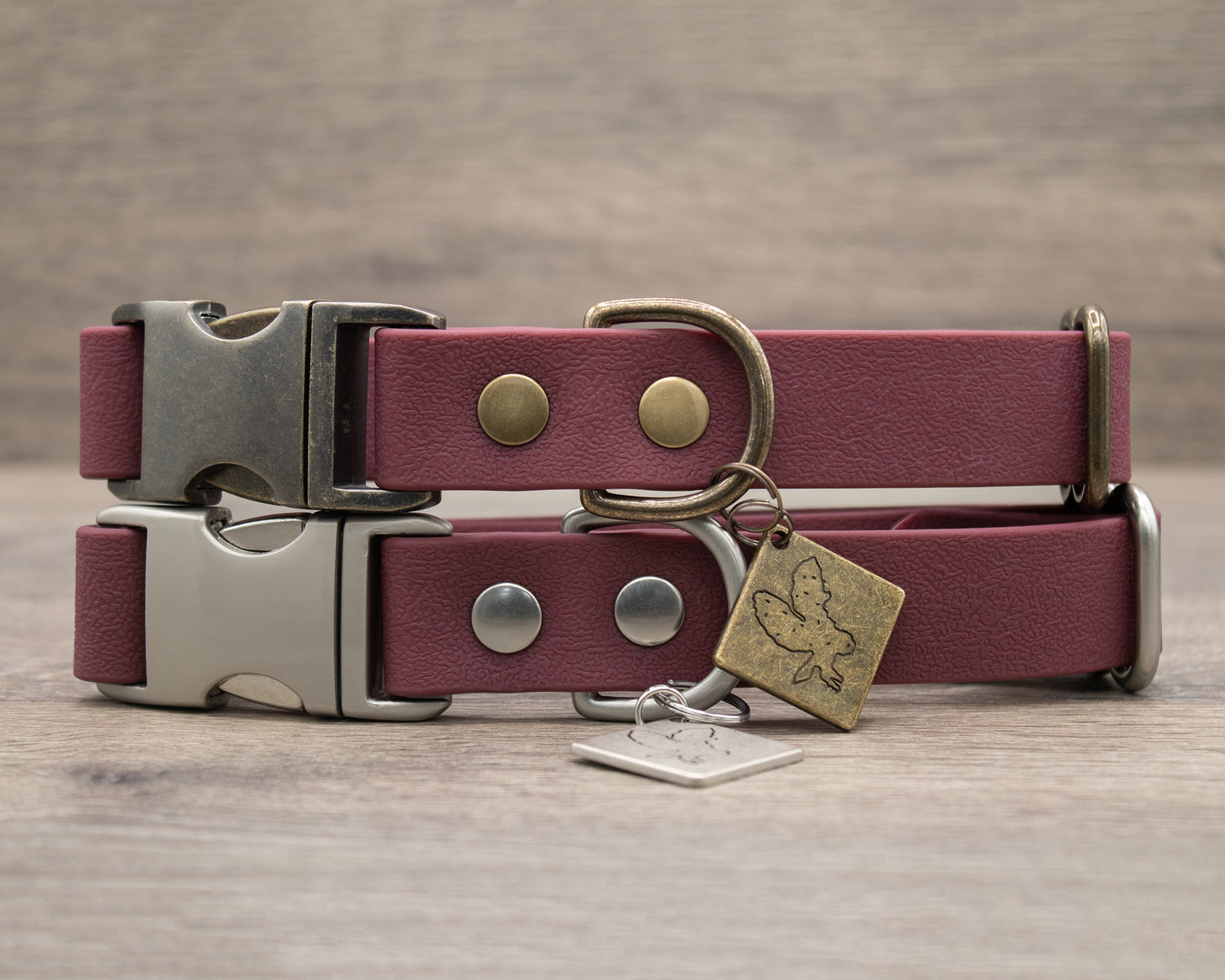 Your new favorite adventure collar! All of our collars are made with a custom coated webbing and our very own colors! Although they may look similar to leather, they are made with a durable coated webbing that can withstand the elements. They are waterproof, mold resistant, and low maintenance! We use zinc alloy coated buckles and solid brass hardware, both of which are resistant to rust. Brass hardware can patina with use when exposed to water + sun and may rub onto lighter coated coats.