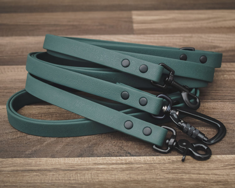 Your new favorite adventure leash! All of our leashes are made with a custom coated webbing and our very own colors! Although they may look similar to leather, they are made with a durable coated webbing that can withstand the elements. They are waterproof, mold resistant, and low maintenance! These leashes are a combination of PVD coated and powder coated hardware.