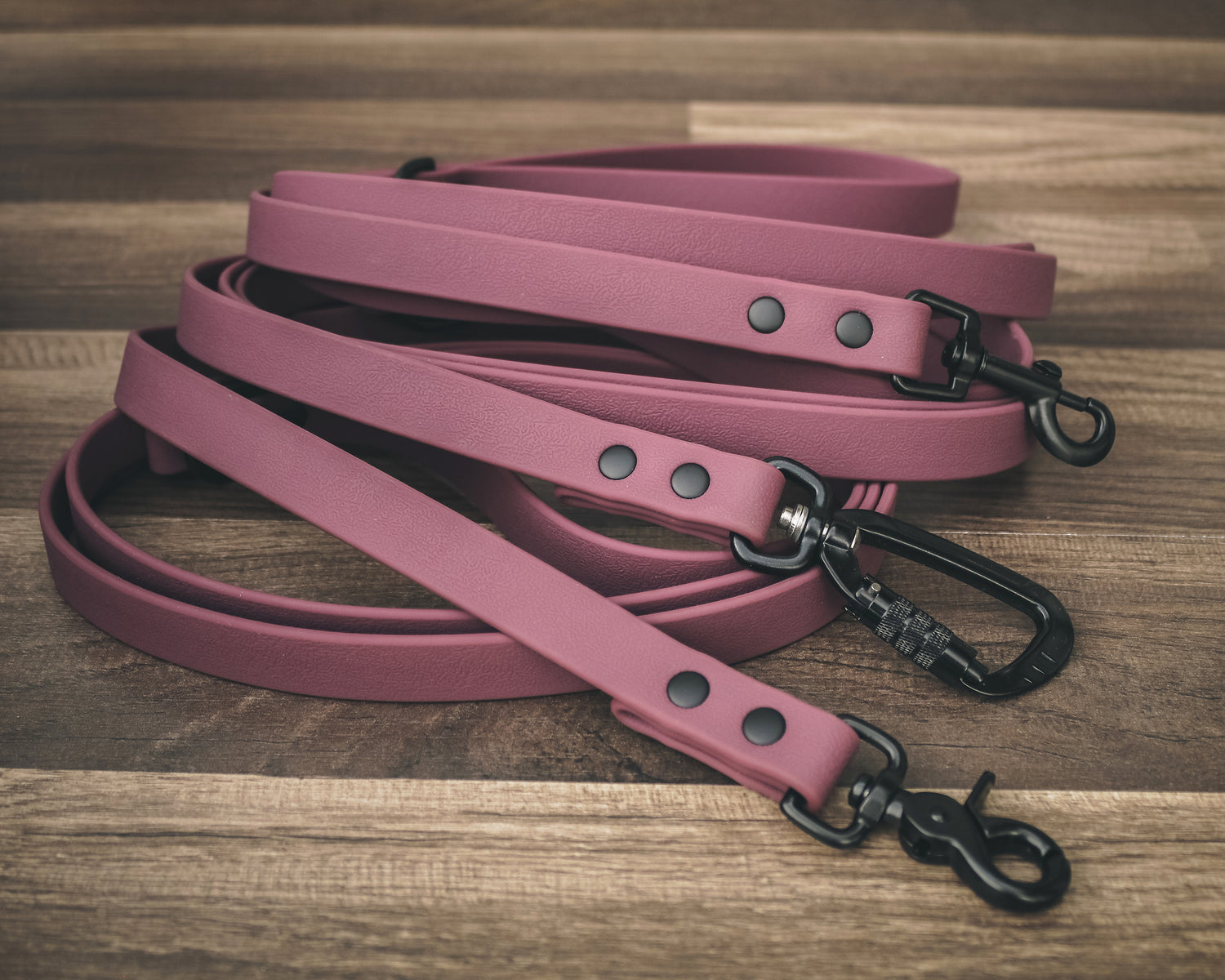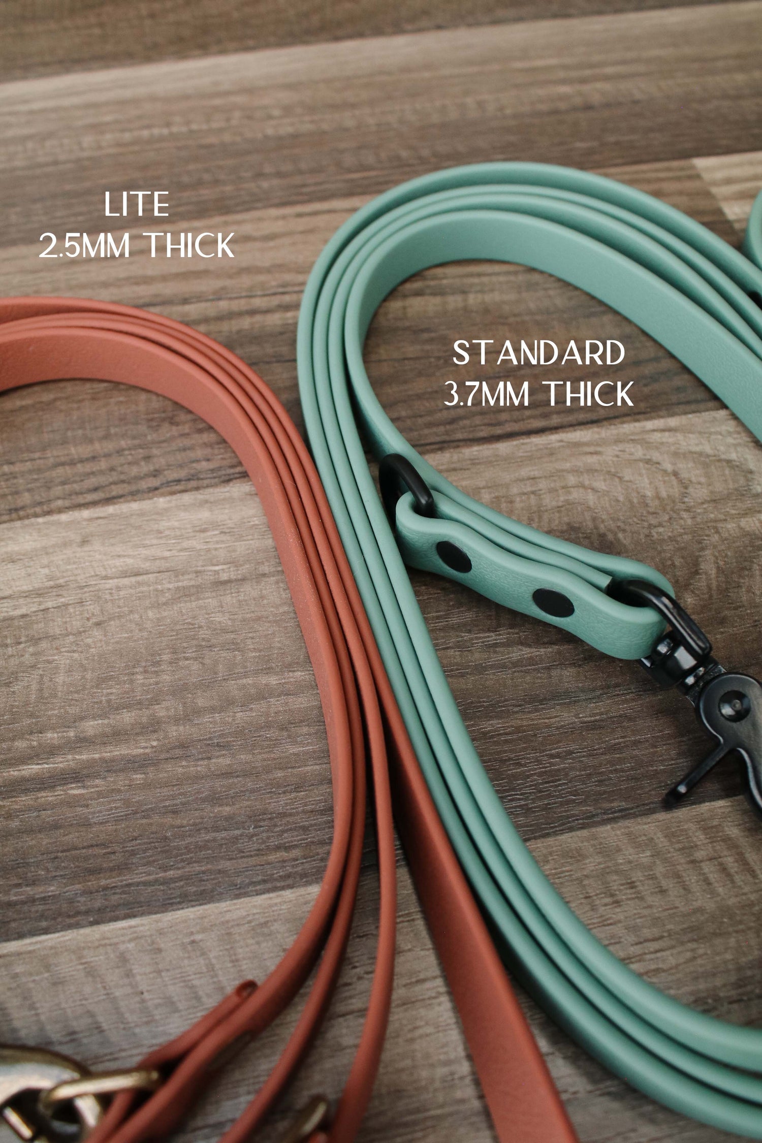 Your new favorite adventure leash! All of our leashes are made with a custom coated webbing and our very own colors! Although they may look similar to leather, they are made with a durable coated webbing that can withstand the elements. They are waterproof, mold resistant, and low maintenance! These leashes are a combination of PVD coated and powder coated hardware.