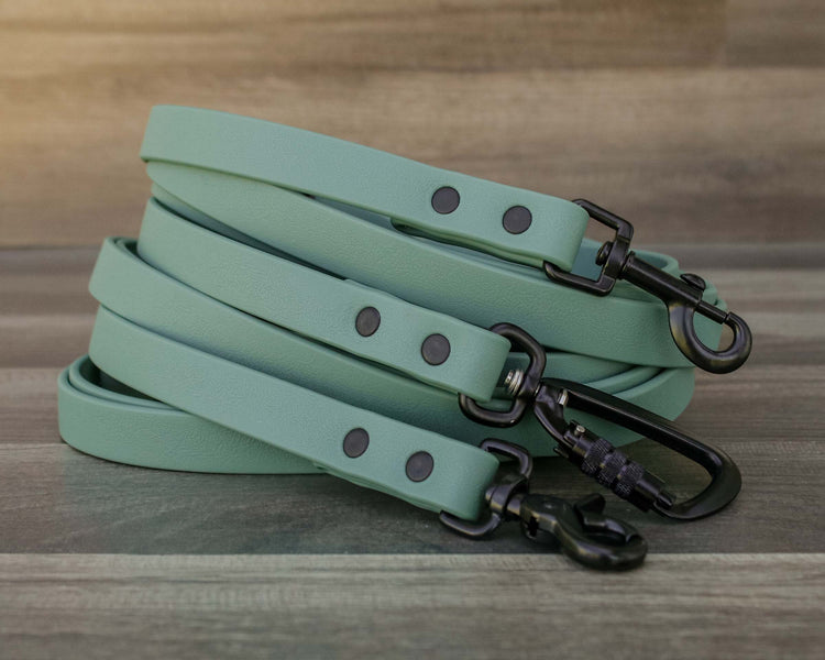 Your new favorite adventure leash! All of our leashes are made with a custom coated webbing and our very own colors! Although they may look similar to leather, they are made with a durable coated webbing that can withstand the elements. They are waterproof, mold resistant, and low maintenance! We use solid brass hardware which are resistant to rust. Brass hardware can patina with use when exposed to water + sun and may rub onto lighter coated coats.