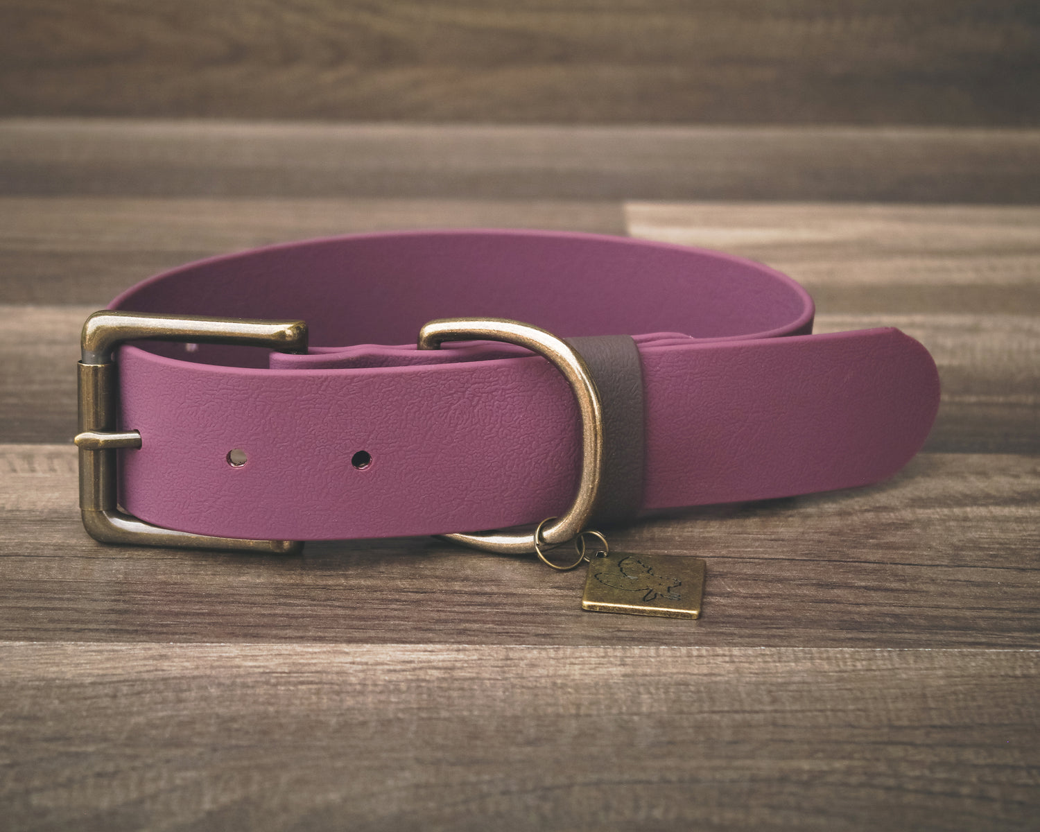 Your new favorite adventure collar! All of our collars are made with a custom coated webbing and our very own colors! Although they may look similar to leather, they are made with a durable coated webbing that can withstand the elements. They are waterproof, mold resistant, and low maintenance! We use zinc alloy coated buckles and solid brass hardware, both of which are resistant to rust. Brass hardware can patina with use when exposed to water + sun and may rub onto lighter coated coats.