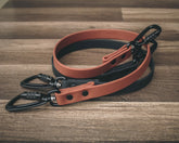 All of our safety buckles are made with a custom coated webbing and our very own colors! Although they may look similar to leather, they are made with a durable coated webbing that can withstand the elements. They are waterproof, mold resistant, and low maintenance! The black locking carabiners themselves have a break strength of 880lbs. We will be doing further testing for the entire strapping soon.