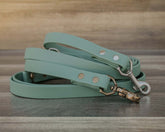 Your new favorite adventure leash! All of our leashes are made with a custom coated webbing and our very own colors! Although they may look similar to leather, they are made with a durable coated webbing that can withstand the elements. They are waterproof, mold resistant, and low maintenance! We use solid brass hardware which are resistant to rust. Brass hardware can patina with use when exposed to water + sun and may rub onto lighter coated coats.