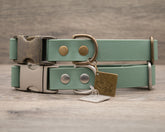 Your new favorite adventure collar! All of our collars are made with a custom coated webbing and our very own colors! Although they may look similar to leather, they are made with a durable coated webbing that can withstand the elements. They are waterproof, mold resistant, and low maintenance! We use zinc alloy coated buckles and solid brass hardware, both of which are resistant to rust. Brass hardware can patina with use when exposed to water + sun and may rub onto lighter coated coats.