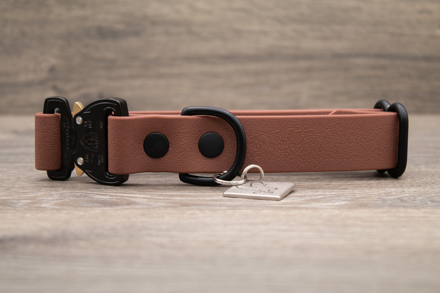 Your new favorite adventure collar! All of our collars are made with a custom coated webbing and our very own colors! Although they may look similar to leather, they are made with a durable coated webbing that can withstand the elements. They are waterproof, mold resistant, and low maintenance! We use zinc alloy coated buckles and solid brass hardware, both of which are resistant to rust. Brass hardware can patina with use when exposed to water + sun and may rub onto lighter coated coats.
