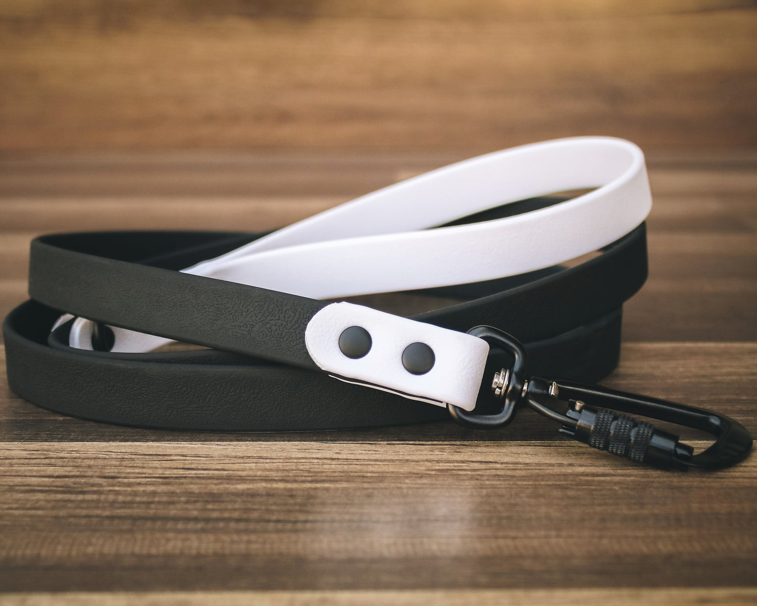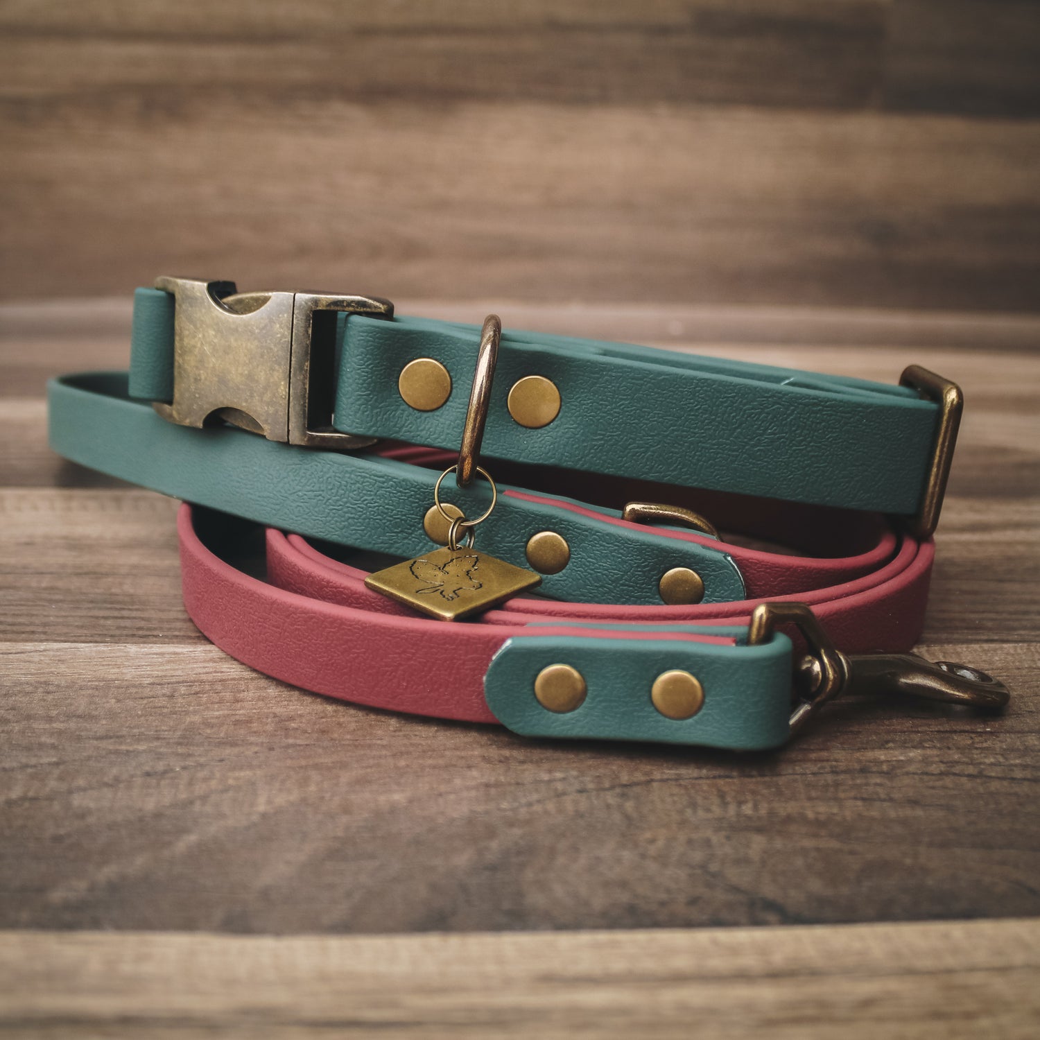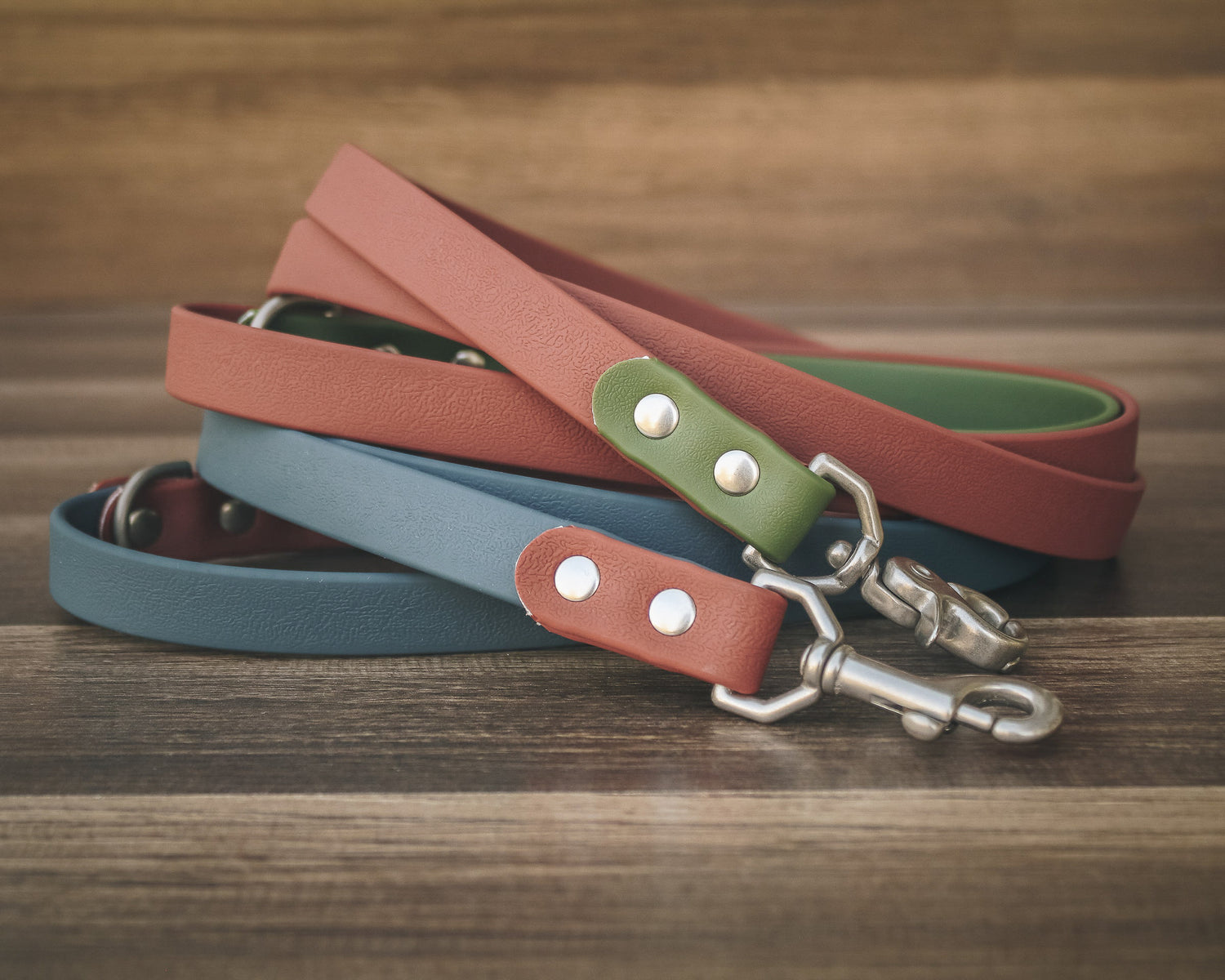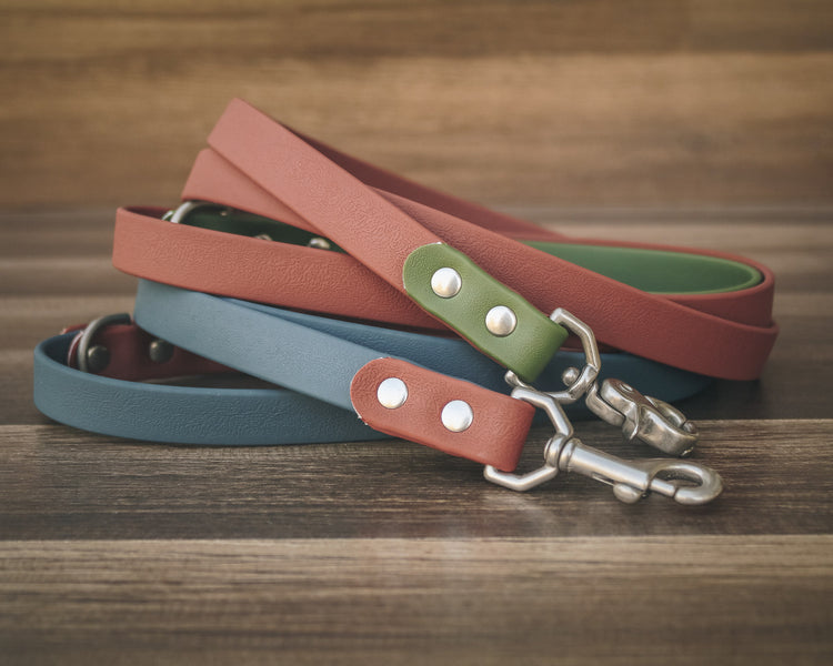 Your new favorite adventure leash! All of our leashes are made with a custom coated webbing and our very own colors! Although they may look similar to leather, they are made with a durable coated webbing that can withstand the elements. They are waterproof, mold resistant, and low maintenance! We use solid brass hardware which are resistant to rust. Brass hardware can patina with use when exposed to water + sun and may rub onto lighter coated coats.