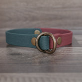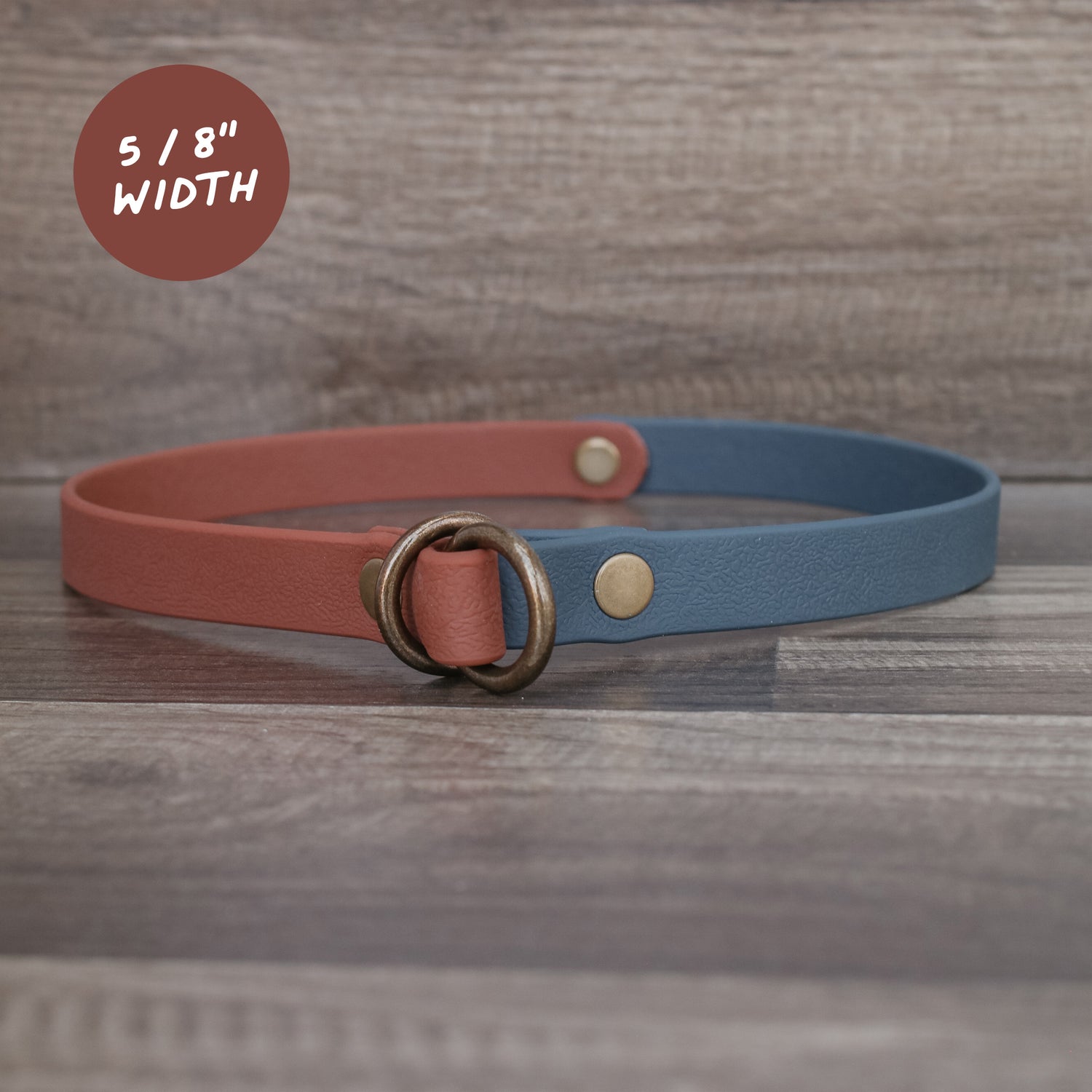 Your new favorite adventure collar! All of our collars are made with a custom coated webbing and our very own colors! Although they may look similar to leather, they are made with a durable coated webbing that can withstand the elements. They are waterproof, mold resistant, and low maintenance! We use solid brass hardware which are resistant to rust. Brass hardware can patina with use when exposed to water + sun and may rub onto lighter coated coats.