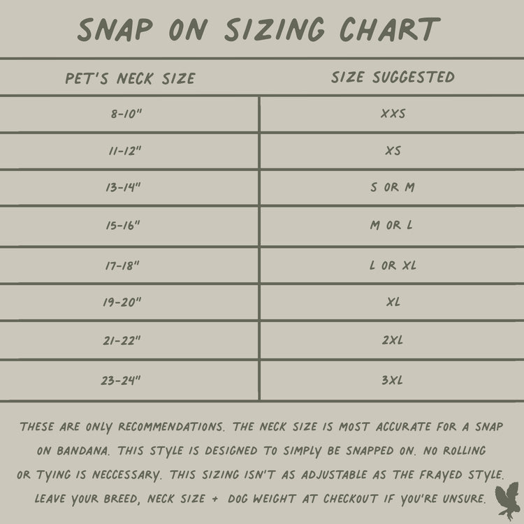 For the most accurate sizing, we ask that you provide us with a neck measurement when possible. When giving us a neck measurement please measure at or around where the collar would sit and leave little to no wiggle room. We have come up with our sizing chart based on a snug measurement and we will leave the extra room so the bandana is not too tight. If you are unable to take a measurement, that’s alright! We will try our best to accommodate a perfect fit based on breed and/or approximate weight. Please see size chart in photos for reference. If your pet has a lot of fur, we recommend sizing up one so the bandana is more visible.