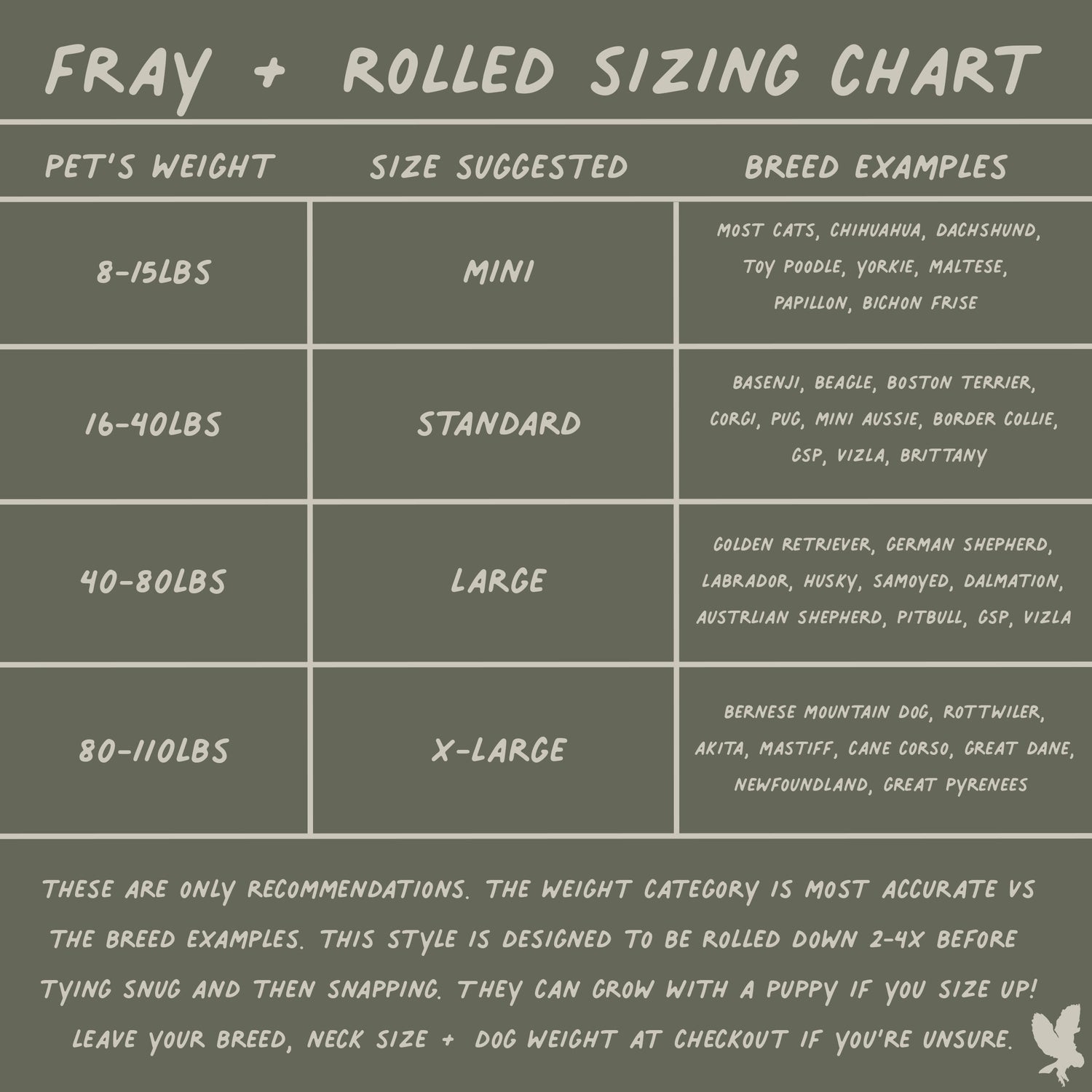 Our newly designed frayed bandanas are all the talk this fall season. Each item is handmade from start to finish. Each bandana features a genuine leather tag, frayed edges around all four edges, an added snap for durability and a instructional card with wear and wash information. With more adjustability, our new style only comes in four sizes. Please adjust the sizing from our standard bandanas to the fray as they're different. If your dog is fluffy, go with the larger of the two if the size falls into both categories. Example - An Australian shepherd will fit a Large fray best, but a Vizla can fit a standard due to small neck size and limited fur.