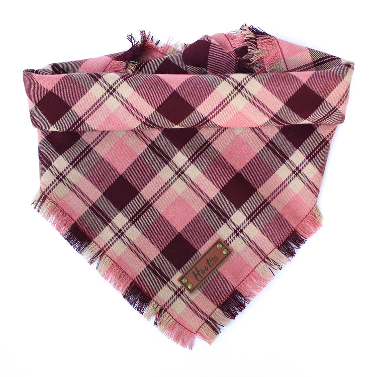 Each bandana features a faux leather tag, frayed edges around all four edges, and an added snap for durability. Simply roll + tie the bandana to fit your pup. This style has more sizing adjustability than a snap on.