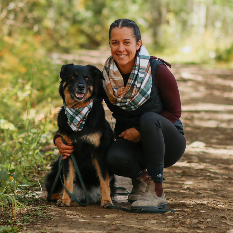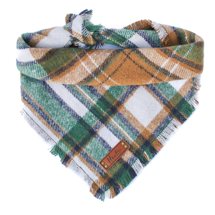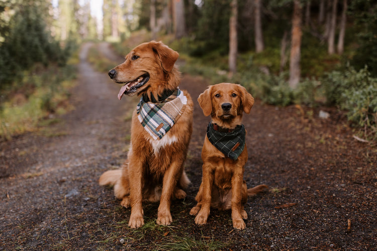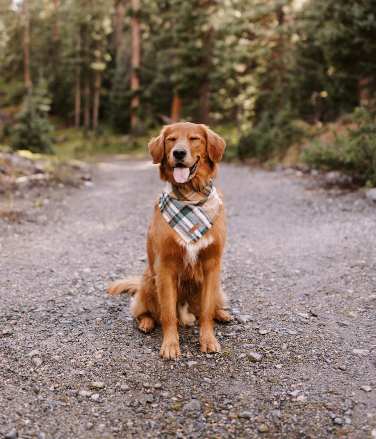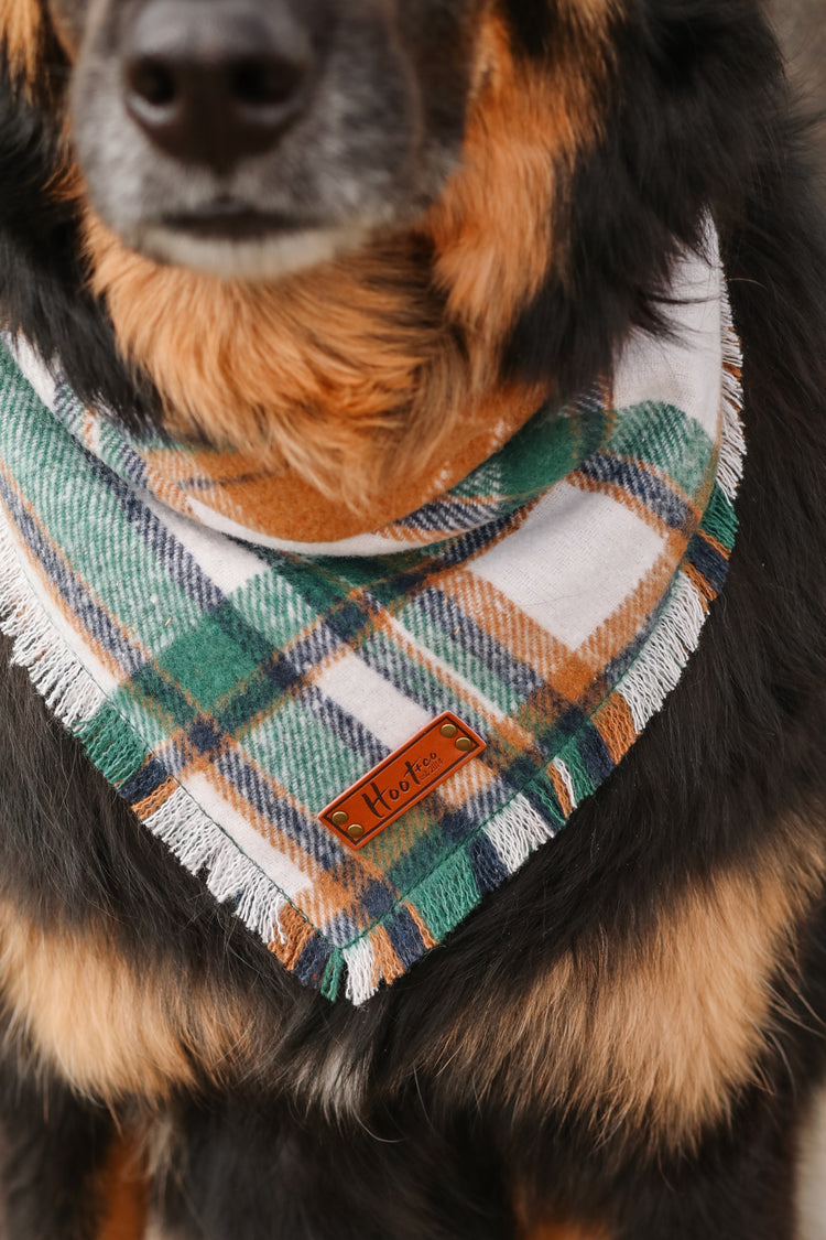 Each bandana features a faux leather tag, frayed edges around all four edges, and an added snap for durability. Simply roll + tie the bandana to fit your pup. This style has more sizing adjustability than a snap on.