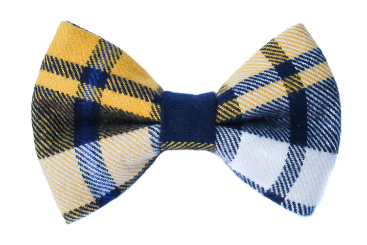 Our pet bow ties are made with high quality fabric and a built in stabilizer to prevent from becoming squished over wear. Each one has a velcro loop that wraps snugly on your pets collar. Each bow tie has a coordinating color in the inside to match. Each bow tie may have a different pattern, depending on how it's cut.