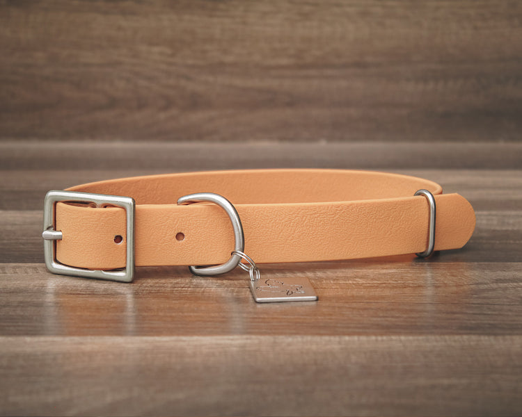 Your new favorite adventure collar! All of our collars are made with a custom coated webbing and our very own colors! Although they may look similar to leather, they are made with a durable coated webbing that can withstand the elements. They are waterproof, mold resistant, and low maintenance! We use zinc alloy coated buckles and solid brass hardware, both of which are resistant to rust. Brass hardware can patina with use when exposed to water + sun and may rub onto lighter coated coats.