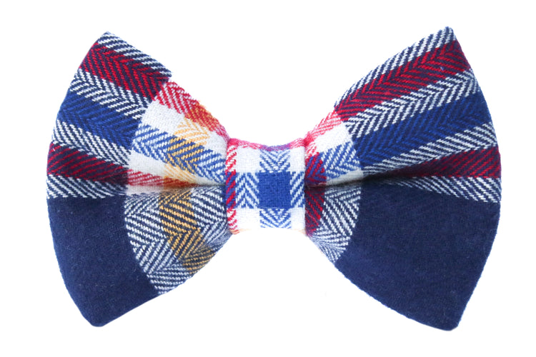 Our pet bow ties are made with high quality fabric and a built in stabilizer to prevent from becoming squished over wear. Each one has a velcro loop that wraps snugly on your pets collar. Each bow tie has a coordinating color in the inside to match. Each bow tie may have a different pattern, depending on how it's cut.
